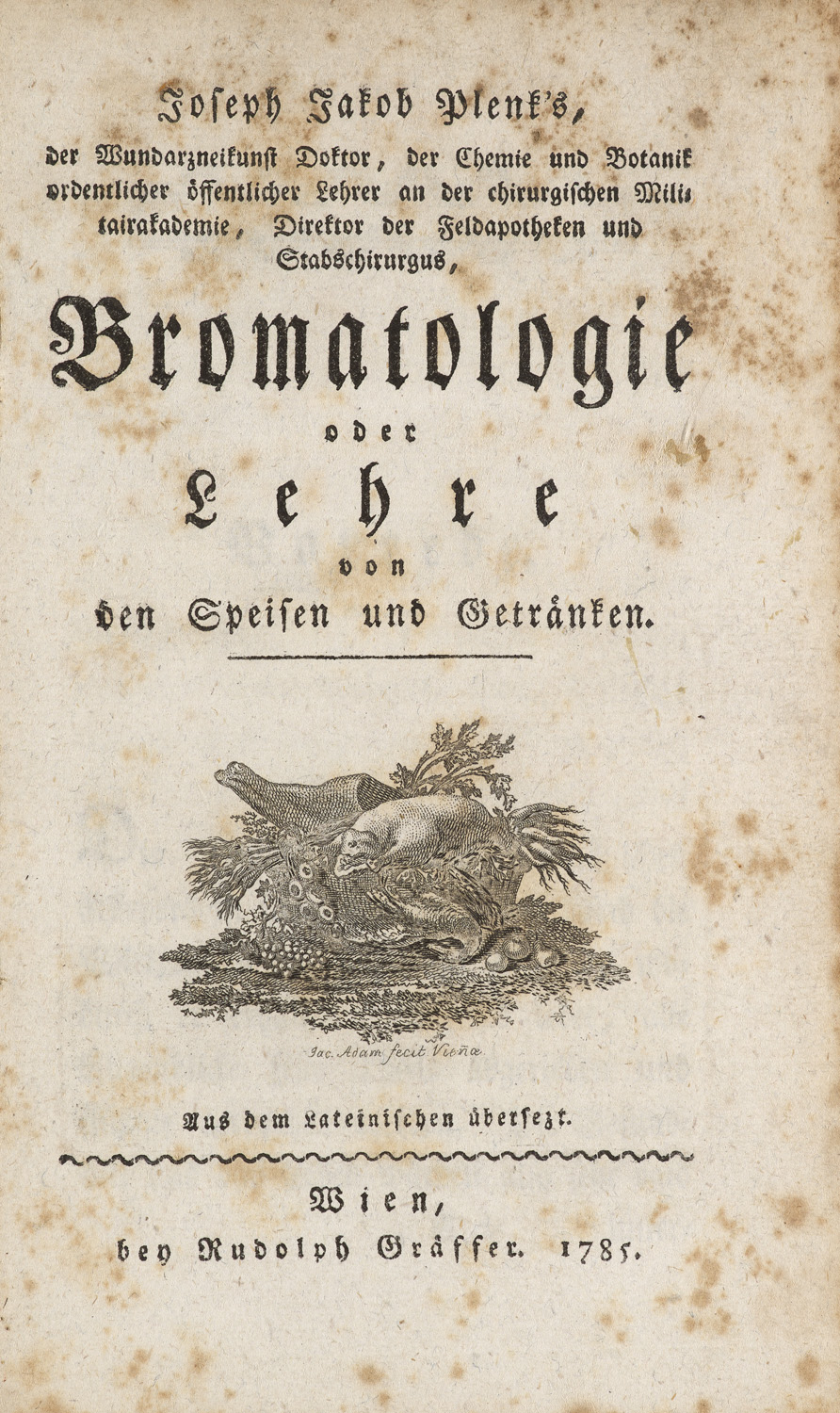 Bromatologie oder Lehre von den Speisen und Getränken. Aus dem Lateinischen übersetzt. Mit gestochener Titelvignette. Wien, Gräffer, 1785. 432 S. 8°. Pp. d. Zt. mit RSchild (etwas berieben, beschabt und bestoßen).