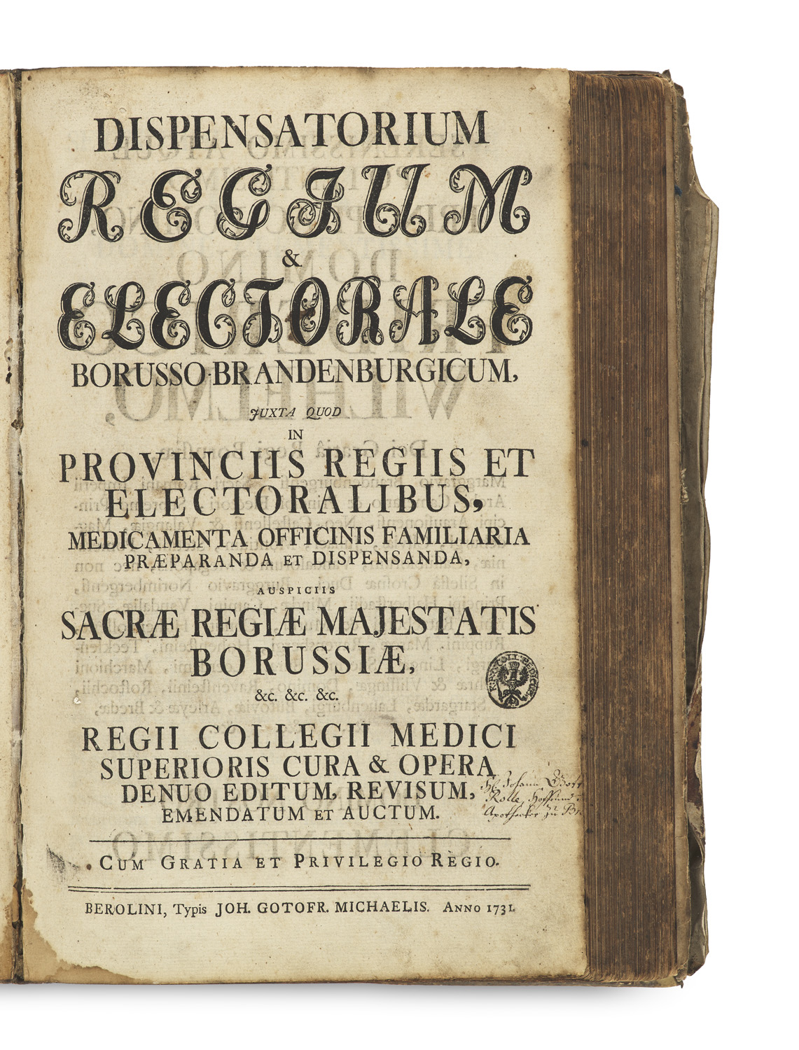 Natural Sciences – Pharmacy. - 3rd edition of the rare, first national pharmacopoeia (EA 1698). - Schelenz 567 - Ferchl 126 - Blake 349 - Rare pharmacopoeia, a set of rules for the manufacture and dispensing of medicines in the royal Prussian and electoral Brandenburg provinces. Contains regulations for the preparation of medicines for pharmacists and medical institutions to ensure uniform quality and efficacy. - Somewhat browned and slightly stained in places.