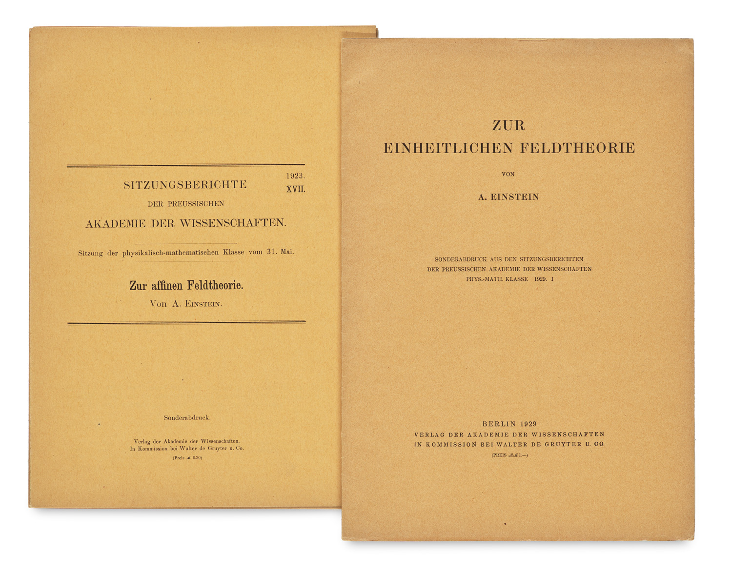 Naturwissenschaften – Sammlung von vier, darunter zwei wissenschaftsgeschichtlich äußerst bedeutenden Aufsätzen Einsteins zur Entwicklung einer einheitlichen Feldtheorie. - Alicke (1) 113 u. (4) 141. - Boni (1) 142, (3) 171, (4) 183. - (1) Norman Library I, 698 u. (4) 700. - (4) PMM 416. - Schilpp/Shields 175, 176, 218, 226. - Weil *132, 137, 162 u. *165 (quotes the pagination of the first separate printing, p. 224-227). - Enthält: 1. Albert Einstein. Zur affinen Feldtheorie. (= Sitzungsberichte der Preussischen Akademie der Wissenschaften, XVII (1923). Sitzung der physikalisch-mathematischen Klasse vom 31. Mai 1923.) Berlin: Verlag der Akademie der Wissenschaften (Komm. de Gruyter (Reichsdruckerei), 28. Juni 1923, Ss. 137-140. Gr.-8°. OBr. mit Umschl.tit. - Erster Sonderabdruck des Aufsatzes beinhaltend Einsteins erstem Versuch, eine einheitliche Feldtheorie zu formulieren. - In dieser bedeutenden Abhandlung untersucht Einstein auf Basis der bahnbrechenden Forschungen von Hermann Weyl erstmals "affine Geometrien" und führt zur Annäherung an eine einheitliche Feldtheorie den Begriff der "fernen Parallelität" ein. - Sehr leicht gebräunt, sonst tadellos. - 2. Ders. Bietet die Feldtheorie Möglichkeiten für die Lösung des Quantenproblems? (= Sitzungsberichte der Preussischen Akademie der Wissenschaften, XXXIII (1923). Sitzung der physikalisch-mathematischen Klasse vom 13. Dezember 1923.) Berlin: Verlag der Akademie der Wissenschaften (Komm. Reimer (Reichsdruckerei), 15. Januar 1924, Ss. 359-364. Gr.-8°. OBr. mit Umschl.tit. - Erster Sonderabdruck dieses programmatischen Artikels von Einstein über die Ableitung der Quantenzustände aus seinen Feldgleichungen. - Sehr gering gebräunt, ansonsten einwandfreies Exemplar. - 3. Ders. Neue Möglichkeit für eine einheitliche Feldtheorie von Gravitation und Elektrizität. Sitzungsberichte der Preussischen Akademie der Wissenschaften, physikalisch-mathematische Klasse, XVIII (1928). Berlin: Verlag der Akademie der Wissenschaften (Komm. Reimer (Reichsdruckerei), 10. Juli 1928, Ss. 359-364. Gr.-8°. OBr. mit Umschl.tit. - Erster Sonderabdruck von Einsteins Aufsatz beinhaltend einen weiterentwickeltem Versuch für eine einheitliche Feldtheorie. - Papier minimal altersbedingt fleckig, ansonsten sehr gut erhaltenes Exemplar. - 4. Ders. Zur einheitlichen Feldtheorie. (= Sitzungsberichte der Preussischen Akademie der Wissenschaften, physikalisch-mathematische Klasse, I (1929). Berlin: Verlag der Akademie der Wissenschaften (Komm. Reimer (Reichsdruckerei), 30. Januar 1929, 8 S. Gr.-8°. OBr. mit Umschl.tit. - Eine der letzten großen wissenschaftlichen Arbeiten Einsteins. Laut Weil "stellt diese Abhandlung eine neue Entwicklung dar, die sofort Schlagzeilen machte. Eine Übersetzung von L. L. Whyte erschien am 4. Februar 1929 in der (Londoner) Times. Sie wurde vollständig in "Observatory", Band 52, unter dem Titel "New Field Theory" auf den Seiten 82-87 und (1930) auf den Seiten 11-118 zitiert." 1928 begann Einstein einen neuen Ansatz für eine einheitliche Feldtheorie, der das beinhaltete, was er als "ferne Parallelität" bezeichnete. Anfang 1929 hatte er die wichtigsten Probleme im Zusammenhang mit der Aufstellung der Feldgleichungen für seine einheitliche Feldtheorie gelöst. Am Tag der offiziellen Veröffentlichung des dritten Teils einer beeindruckenden technischen Serie von neun Artikeln über die Theorie erschienen begeisterte Schlagzeilen in Zeitungen auf der ganzen Welt. (Vgl. Parkinson, Breakthroughs, S. 279.) - Die Verlagsliste der Sonderabdrucke auf der Rückseite führt den vorliegenden nicht als letzten auf. Alle danach aufgeführten wurden 1929 gedruckt. Der Satz ist identisch mit anderen authentifizierten Exemplaren des ersten Sonderabdrucks. Dies deutet darauf hin, dass es sich auch bei unserem Exempar um einen ersten Sonderabdruck handelt, jedoch wahrscheinlich mit einem späteren Umschlag versehen. - Mit leichter Bräunung, ansonsten makellos, ungeöffnet, ungelesen.