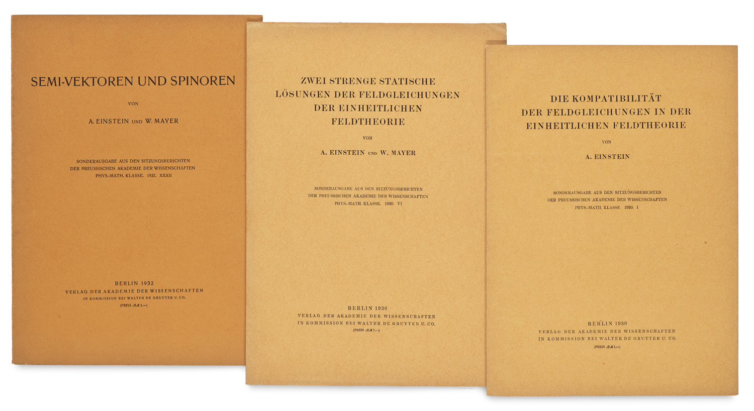 Naturwissenschaften – Drei späte, substantielle Aufsätze Einsteins zu Feldgleichungen, teils gemeinsam mit Assistent W. Mayer, darunter die letzte Veröffentlichung Einsteins, bevor er NS-Deutschland verlassen musste. - Alicke (2) 144 u. (3) 152. - Boni 195, 196 u. 217. - Schilpp/Shields 239, 240 u. 250. - Weil 169, 170 u. 186 (je für den ersten Separatdruck, mit abweichender Papinierung S. 18-23, S. 110-120 u. 522-550). - (4) Pais, Subtle is the Lord, Ss. 451f. - Enthält: 1. Albert Einstein. Die Kompatibilität der Feldgleichungen in der Einheitlichen Feldtheorie. (= Sitzungsberichte der Preussischen Akademie der Wissenschaften, physikalisch-mathematische Klasse, I (1930). Berlin: Verlag der Akademie der Wissenschaften (Komm. Reimer (Reichsdruckerei), 6. Februar 1930, 8 S. OBr. mit Umschl.tit. - Papierbedingt minimal gebräunt, sonst tadellos. - 2. Ders. u. Walther Mayer. Zwei strenge statische Lösungen der Feldgleichungen der einheitlichen Feldtheorie. (= Sitzungsberichte der Preussischen Akademie der Wissenschaften, physikalisch-mathematische Klasse, VI (1930). Berlin: Verlag der Akademie der Wissenschaften (Komm. Reimer (Reichsdruckerei), 11th March 1930, 13 (1) Seiten. 8°. OBr. mit Umschl.tit. - Verfasst in Zusammenarbeit mit Einsteins Assistenten, dem österreichischen Mathematiker Walther Mayer (Spitzname "Einsteins Rechner"). - Papierbedingt gering gebräunt, sonst sehr gut erhalten. - 3. Ders. u. Walther Mayer. Semi-Vektoren und Spinoren. (= Sitzungsberichte der Preussischen Akademie der Wissenschaften, physikalisch-mathematische Klasse, XXXII (1932). Berlin: Verlag der Akademie der Wissenschaften (Komm. Reimer (Reichsdruckerei), 24th January 1933, 31 (1) S. Gr.-8°. OBr. mit Umschl.tit. - Bahnbrechende Arbeit, zugleich Einsteins letzte Veröffentlichung, bevor er Nazi-Deutschland verlassen musste. - Die vorliegende Arbeit ist das letzte Werk Einsteins, erneut in Zusammenarbeit mit Walther Mayer, das in der Weimarer Republik veröffentlicht wurde (Weil Nr. 187 wurde zuvor gedruckt). Der Sonderdruck wurde genau eine Woche vor der Machtergreifung der Nationalsozialisten am 30. Januar 1933 von den Preußen verteilt. Einstein und auch Mayer mussten nur wenige Monate später aufgrund ihrer jüdischen Herkunft aus Deutschland fliehen. - Einsteins Arbeit über Halbvektoren "wurde durch Ehrenfests Beharren auf einem besseren Verständnis der Beziehung zwischen einwertigen und zweifachwertigen Darstellungen der Lorentz-Gruppe angeregt ... (Einstein und Mayer) setzten sich daran, Halbvektoren mit der Dirac-Gleichung in Verbindung zu bringen und den Formalismus auf die allgemeine Relativitätstheorie zu verallgemeinern" (Pais). - Die Arbeit weist sehr leichte Zeitspuren auf, ansonsten ist das Exemplar neuwertig.