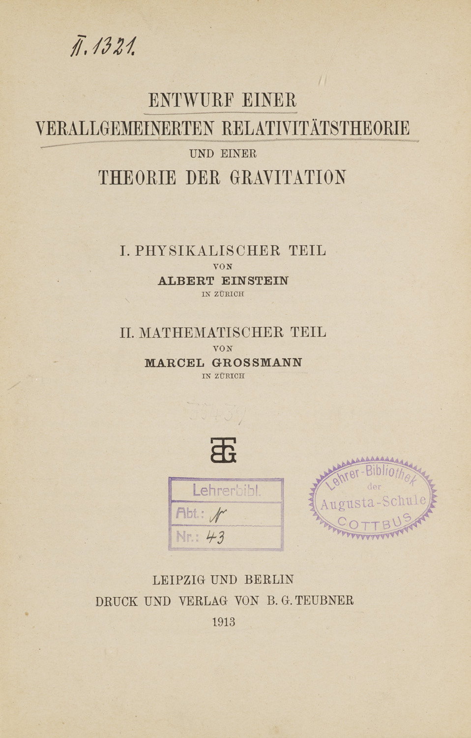 Entwurf einer verallgemeinerten Relativitätstheorie und einer Theorie der Gravitation. I. Physikalischer Teil von Albert Einstein. II. Mathematischer Teil von Michael Grossmann. 2 Tle. in 1 Bd. Leipzig u. Berlin, Teubner, 1913. 38 S. Gr.-8°. OKarton (etwas fleckig, Name auf Umschlag.