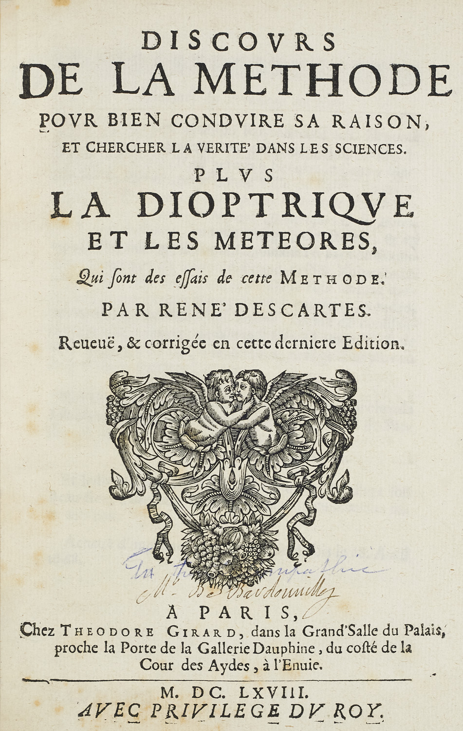 Discours de la méthode, pour bien conduire sa raison et chercher la vérité dans les sciences. Plus la dioptrique et les météores, qui sont des essais de cette méthode. Revue, & corrigée en cette dernière édition. Mit zahlr. Textholzschnitten. Paris, Theodore Girard, dans la grand salle du palais . Avec privilege du Roy., 1668. 2 Bll., 413 S., 15 Bll. Moderner Hldr. mit Buntpapiereinlage.
