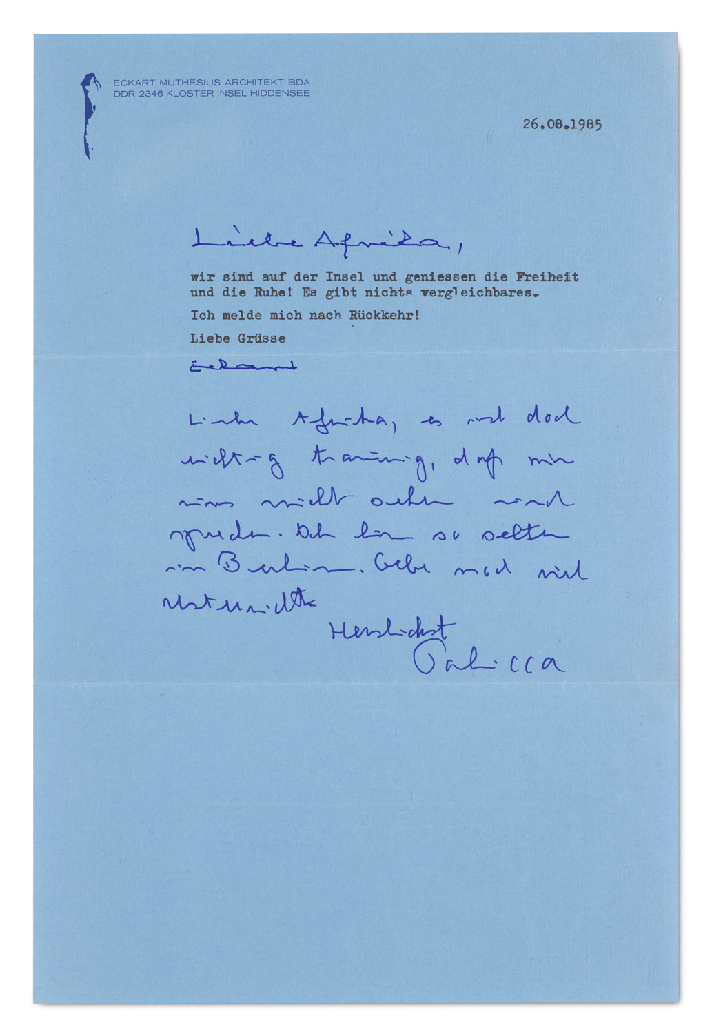 Typoskript mit eigenhändiger Anrede und Unterschrift des deutschen Architekten (1904-1989) sowie eh. Zusatz mit Unterschrift der deutschen Tänzerin (1902-1993) an Afrika von Seefeld (geb. Döring, 1910-1986). (Hiddensee), 26. Aug. 1985. 1 S. blaues Papier mit Wz. u. typogr. Adresskopf. Ca. 27 x 18 cm.