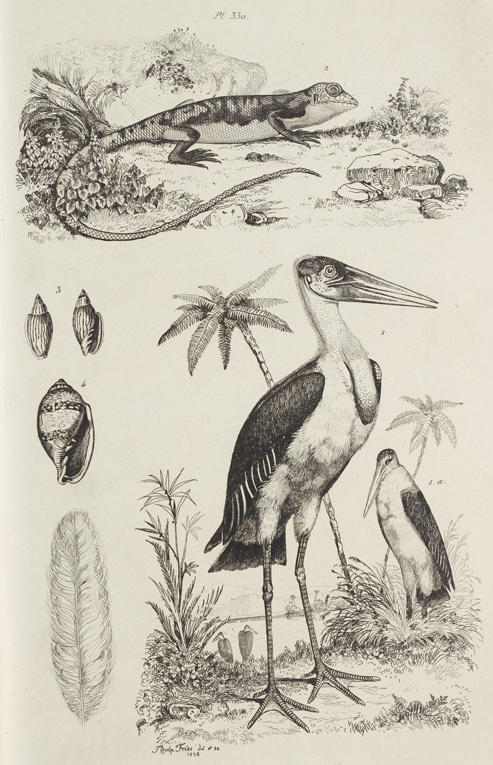 Naturwissenschaften – Erste Ausgabe. - Nissen ZBI 4616. - Graesse III, 171. - Agassiz III, 141,39. - Die meist schönen Tafeln zeigen neben der Menschen-, Tier- u. Pflanzenwelt auch Gesteine u. Werkzeuge. - Teils etwas gebräunt.