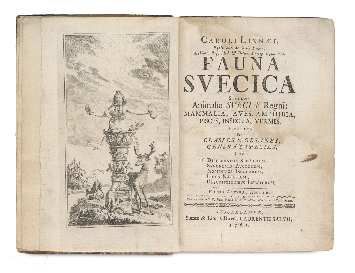 Naturwissenschaften – Zweite erweiterte Ausgabe. - Die zweite Ausgabe von Carl von Linnés Werk zu der Fauna Schwedens. Die erste Ausgabe aus 1746 enthielt über 1300 beschriebene Arten. Diese Zahl wurde in der zweiten Ausgabe noch einmal um über 1000 weitere Arten ergänzt, wodurch diese zweite Ausgabe weitaus umfangreicher ist. - Stockfleckig, wasserfleckig. Mt den zwei gefalteten Kupfertafeln.