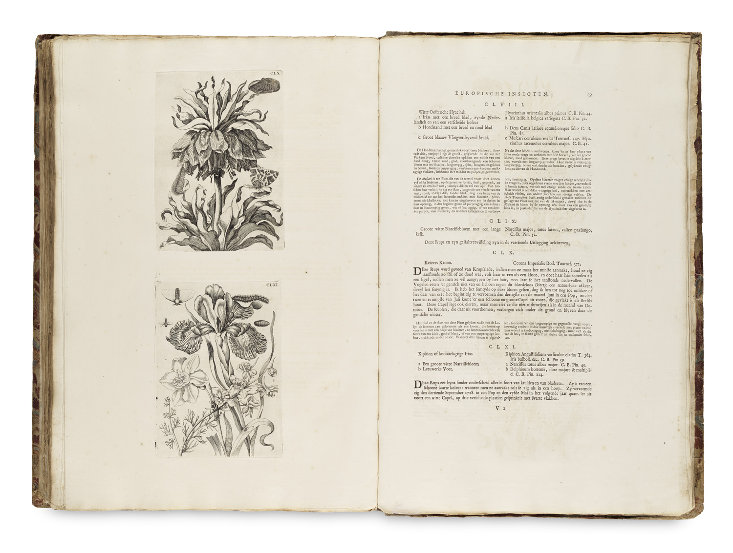 Naturwissenschaften – Erste Ausgabe in Folio und gleichzeitig erste Ausgabe der kompletten Folge von Merians Tafeln zu den Insekten Europas. - Nissen BBI 1342 (zählt fälschlich 186 Taf.) - De Belder (Sotheby's) 238. - Dunthorne 205. - Great Flower Books 67. - Hagen I 536. - Horn/Schenkling III, 14993. - Hunt 483 (Fn., unkolor. Ex.) - Pfeiffer A9. - Unser Exemplar wie zumeist mit unkolorierten Kupfern, aber mit dem oftmals fehlenden Frontispiz. Hier die Fassung mit niederländischem Text, gleichenjahrs bei Bernard auch auf Französisch erschienen. - Die Ausgabe wurde posthum von Merians Tochter Johanna Helena herausgegeben und umfasst das "Raupenbuch" sowie das "Neue Blumenbuch". - "Ihre (Merians) schon beim Raupenbuch erwiesene Meisterschaft, den Pflanzen und Tieren bei der Darstellung ihre Eigentümlichkeit zu erhalten, und sie trotzdem in eine wirksame Bildkomposition hineinzubauen, hat mit dem Surinam-Werk einen unvergleichlichen Höhepunkt erreicht." (Rückert, S. 46ff.) - Die Kupfer CLXX und CLXXII sind nicht auf den Tafeln abgedruckt, sondern bilden, wie stets in den vorliegenden Ausgaben, gemeinsam die Schlussvignette auf S. 84 (2 Blumen-Bouquettes durchbuchstabiert (a-h) bzw. -nummeriert (1-6), mit Verweis auf den Text) Bei Nissen so nicht erwähnt, weshalb dort die falsche Zählung zustande kommt. - Provenienz: Adam Samule Thebesius (1739-1808), deutscher Arzt und Publizist, mit dessen hs. Besitzervermerk auf Vortitel, zusätzl. daselbst gestempelt "A. De J. J. Merian.". - Vorsätze etwas stärker, vorderer Vorsatz mit Knickfalte, letzte Taf. verso stärker fleckig, mitunter leicht stock- und fingerfleckig und marginal mit alten Sporfleckchen, einige Bl. mit kleinen Ausrissen. Insgesamt ein sauberes, breit- und dreiseitig schöpfrandiges Exemplar mit kräftigen, konturierten Abdrucken der Stiche eines der wohl schönsten illustrierten naturwissenschaftlichen Bücher, die je geschaffen wurden.