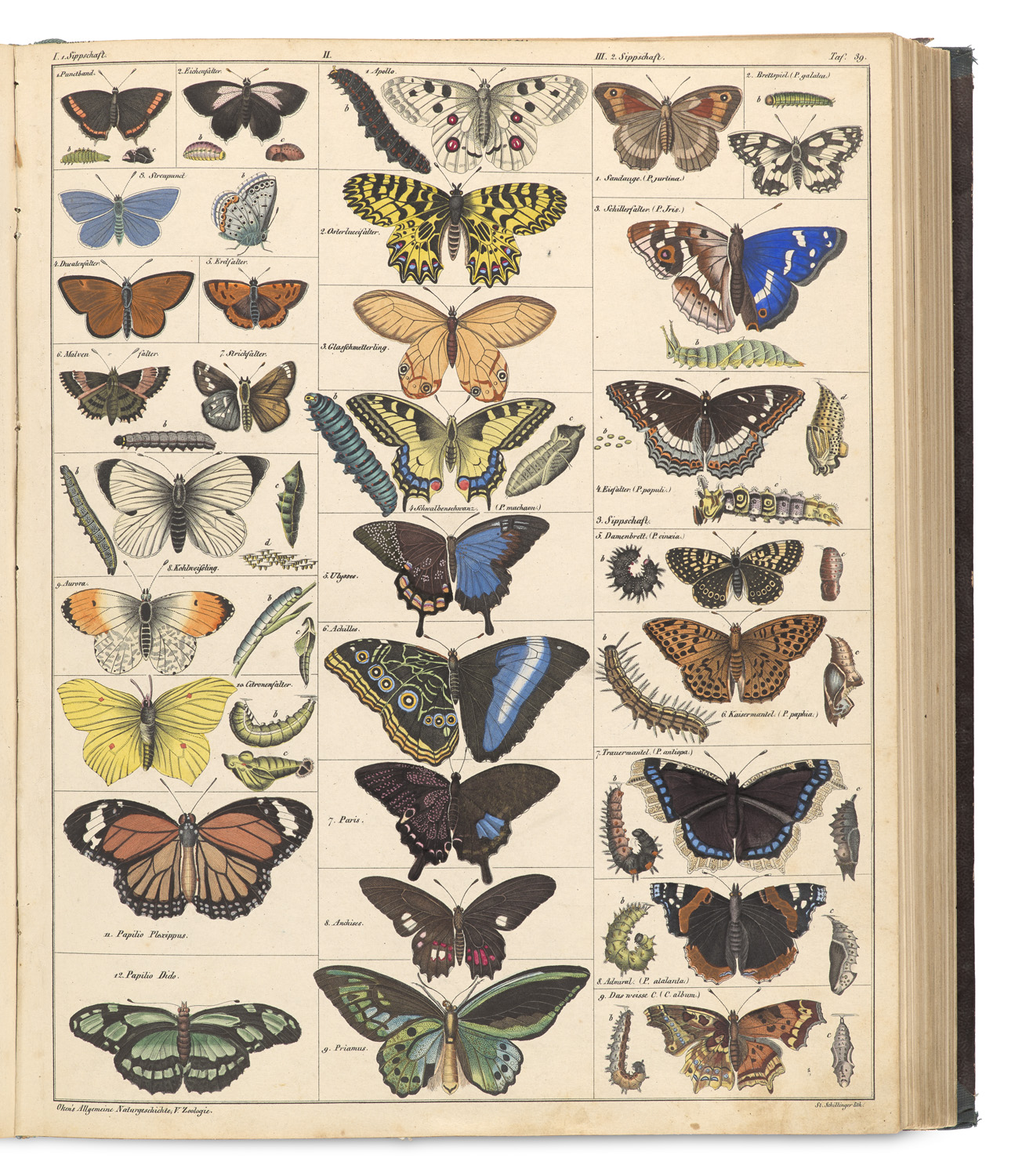 Natural Sciences – Zoology - Parts 4-7 in 8 vols. and atlas. With an engraved portrait frontispiece, atlas with an illustrated title page and 161 mostly coloured plates. Cardboard with gilt stamped spine labels and colour edges on all sides (text volumes), half canvas with gilt stamped title (rubbed and bumped, text volumes dusty and with residue on the spines). - One of the most comprehensive natural histories of its time by the German physician and naturalist Lorenz Oken (1779-1851). - The plates in beautiful, bright colouring with depictions of reptiles, fish, birds, beetles etc. - Foxing, first plates more heavily foxed, margins browned. Overall well-preserved copies with splendid plates.