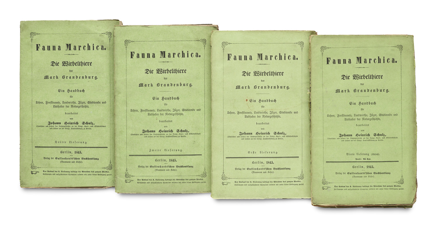 Natural Sciences – First and only edition, complete as published in 4 part issues. - Contains a scientifically described inventory of birds, amphibians and fish found in the Margraviate of Brandenburg at the time. The fourth part issue with index and overview. - Book block of volume 4 partly loose, slightly foxed in places, otherwise well-preserved, complete edition of this rare work of local natural history importance.