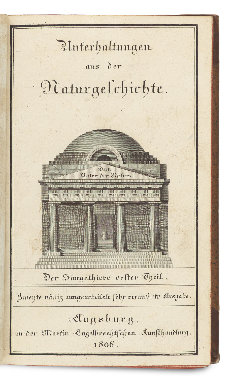 Unterhaltungen aus der Naturgeschichte. Die Säugethiere. 2 Bd. Mit je einem gestochenen Titelblatt und insgesamt 150 kolorierten ganzseitigen Kupferstichen. Augsburg, Martin Engelbrecht, 1806-1809. 640 S. 667 S. 8 Bll. Kl.-8°. HLdr. mit goldgepr. RSchilden und dreiseitigem Rotschnitt (berieben und bestoßen, Gelenk des 2. Bd. angebrochen).