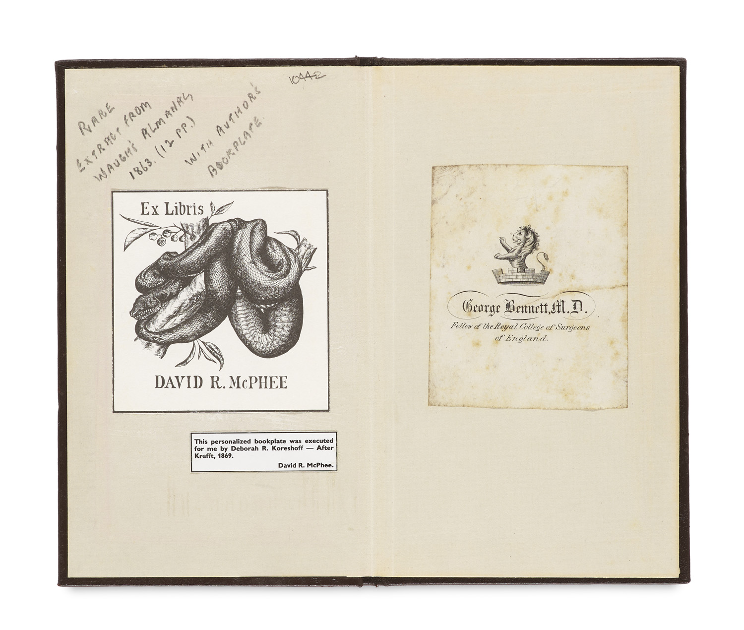 Natural Sciences – Author's copy, additionally with provenance prominent in the field. - Adler IV, p. 146 (mentions Bennett as taxonomic author). - "Rare and sought-after. I am not aware of any copies that have appeared on the market recently. An interesting essay with a peculiar treatise on snake-killing and snake-fearing birds." (McPhee, see below). - Provenance: 1. Author's copy of David Bennett (1804-93), British physician and herpetologist, with his engraved book-plate on front fly-leaf recto. - 2. David R. McPhee, Australian herpetologist, with his book-plate on the front paste-down. - Enclosed: Andrew Isles, Natural History Books, ed. Catalogue 23. The Herpetological Library of David McPhee. 624 items. Prahran, 1996 (present copy item no. 36). - Outer edge of title page with backed defect, slightly time-stained and minimally soiled. Overall clean copy of this extremely rare item.