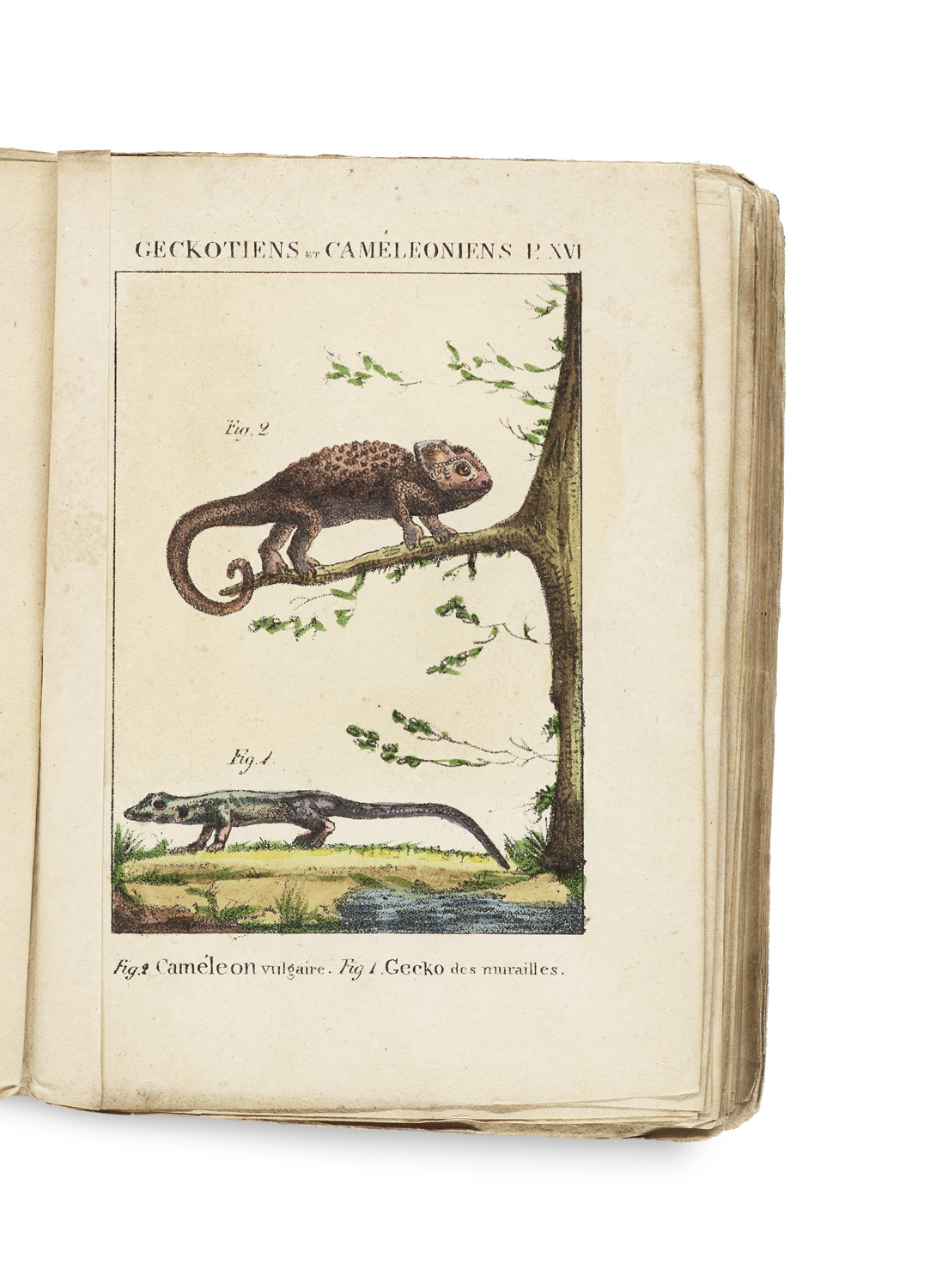 Natural Sciences – Very rare, richly and elaborately illustrated pocket encyclopaedia on herpetology. - For references see above. - With 1 lithographed frontispiece and 52 lithographic plates by Engelmann after Lamouroux and Guérin, 46 of which are hand-coloured. - Curious reference work on herpetology, compiled by French explorer and naturalist Jean Baptiste Bory de Saint-Vincent (1778-1846). - The lithographs are in a neat small format, yet rich in detail and meticulously coloured. - Provenance: Kraig Adler (born 1940), American herpetologist, with his book-plate mounted on the front cover of the small volume. - Occasional light foxing, some of the plates also have a few finger-stains and narrow water-stains. Overall, a well preserved, collectible volume. - Extremely rare, not a single copy found at auction.