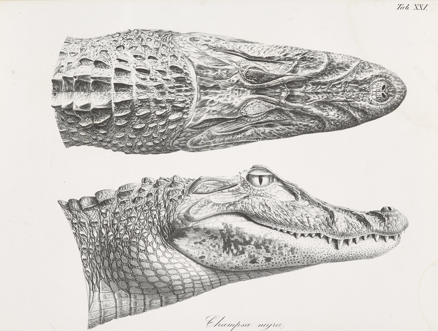 Beitrag zur näheren Kenntniss der südamerikanischen Alligatoren nach gemeinschaftlichen Untersuchungen mit L. J. Fitzinger. Und: Lepidosiren paradoxa. Eine neue Gattung aus der Familie der fischähnlichen Reptilien. In: Annalen des Wiener Museums der Naturgeschichte, Bd. 2. Mit 9 lithographischen Tafeln, wovon 1 gefaltet, und weiteren 21, wovon 12 gestochenen und 9 lithographierten Tafeln, davon 2 farbig, sowie zahlreichen Tabellen im Text. Wien, Selbstvlg., o. J. (1840). Ss. 165-170 u. 311-324. Lex.-4°. Marmor. Pbd. d. Zt. mit goldgepr. RTit. auf Papierschildchen und umseitig grün gesprenk. Schnitt (Bezug an den Gelenken stellenw. gering abgeplatzt, etwas bestoßen und berieben, Rücken und Hinterdeckel mit Resten früherer Etikettierung).