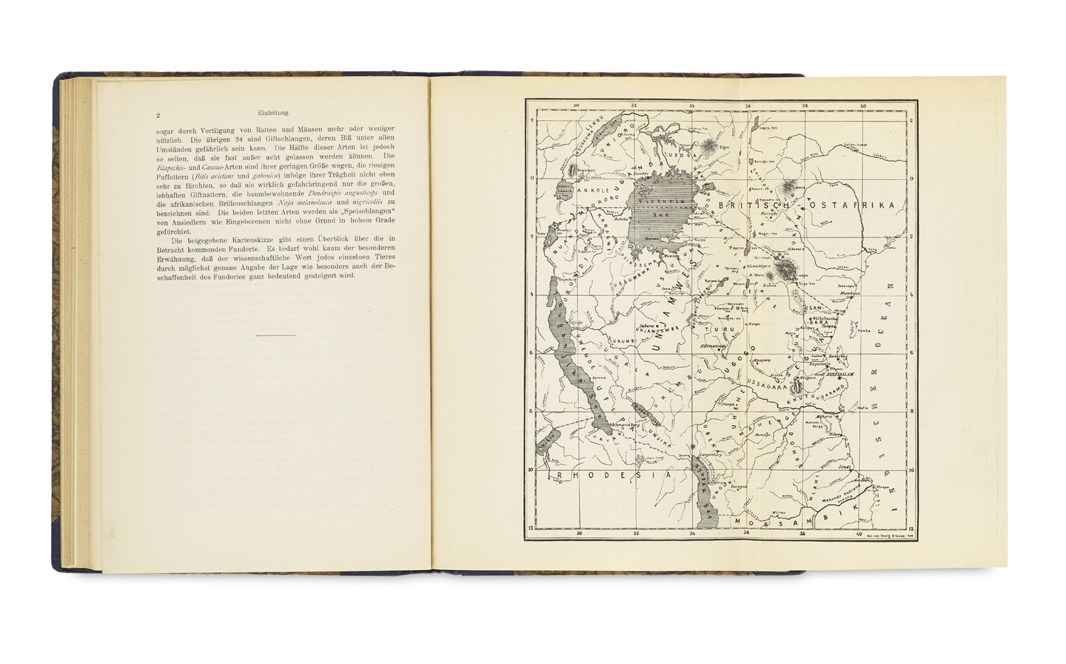 Natural Sciences – Sammelband with seven richly illustrated, rare essays on herpetology of the German colonies in Africa. - Adler IV, pp. 166 and 173 (mentioning Nieden and Sternfeld as taxonomists). With 7, where of 1 folding and 2 double-paged maps as well as 447 text illustrations.- Contains extensive essays by German herpetologists Richard Sternfeld and Fritz Nieden on reptiles (especially snakes) and amphibians of present-day Cameroon, Togo, German East Africa, German South West Africa (Namibia) and the South Seas, each with a map drawn by Georg Krause and hundreds of text illustrations based on drawings. - Provenance: George Sprague Meyers (1905-85), American zoologist and ichthyologist, with his beast stamp and signature on the front cover.Paper time-stained, otherwise well-preserved copy.