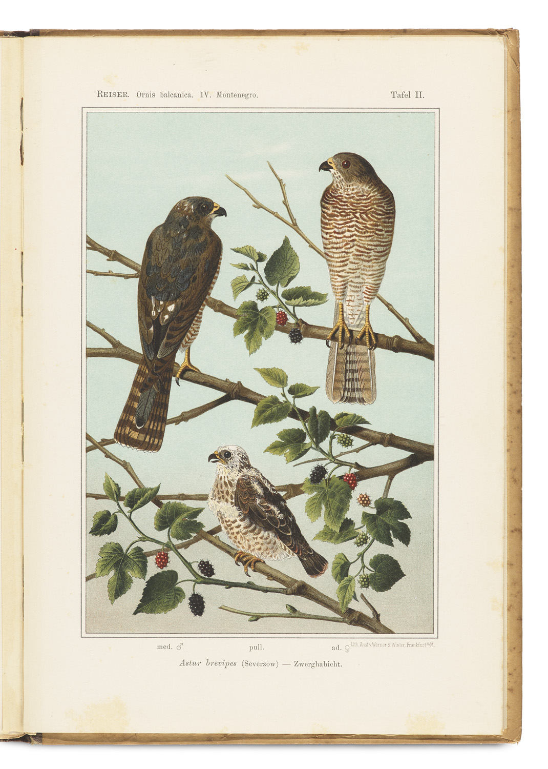 Naturwissenschaften – Für Bd. II-IV. Zimmer Catalogue E. E. Ayer, 517-518. - Nissen IVB, 771. - Band II-IV wurden von dem Bosnisch-Herzegovinischem Landesmuseum in Sarajewo herausgegeben und behandeln die Avifauna von Bulgarien, Griechenland und Montenegro. Der erste Band ist über dreißig Jahre nach dem dritten Band von den Analen des naturhistorischen Museums in Wien herausgegeben worden und umfasst die Vogelarten von Bosnien und Herzegowina. - Othmar Reiser war ein österreichischer Ornithologe und Biologe, der viele Reisen in den Ländern des Balkans unternahm. - Mit 7 farblithographischen Abbildungen von Vogelarten der Region. - Ränder teils leicht gebräunt. Lithographien farbprächtig. Insgesamt sehr gut erhalten.