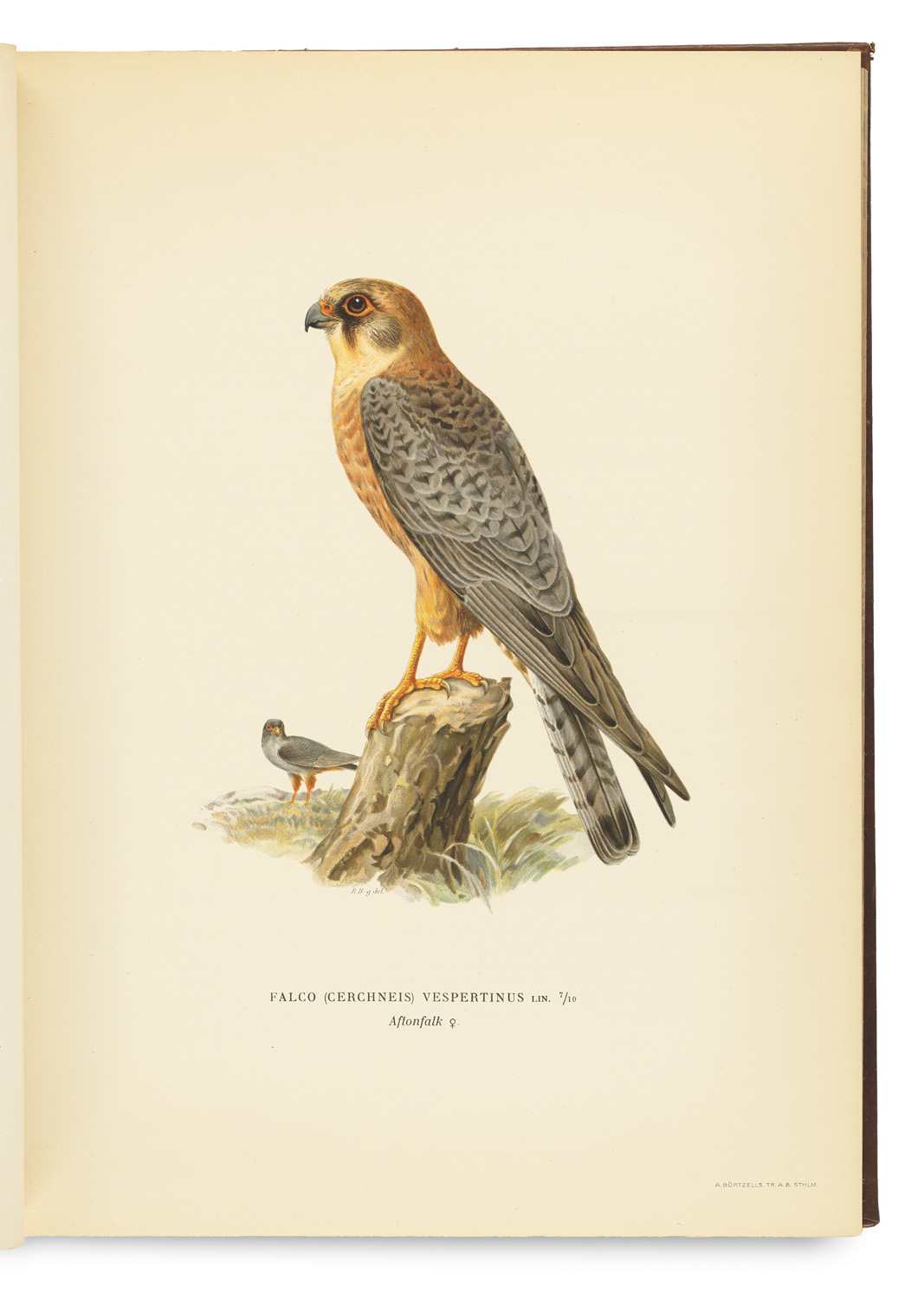 Natural Sciences – Zoology. - Ornithology. - 3 vols. With 364 full-page color lithographs. Marbled calf with gilt-embossed cover vignette, gilt-embossed label and gilt on back board. Marbled edges. (Rubbed and bumped.) - Second edition. - Nissen IVB, 1026 - Contains a biography of the Wright brothers at the end of the third volume. - The first edition of this work on the avifauna of Sweden was published in 1828 and contained 184 lithographic illustrations. When a new edition of the book was published almost a century later, the already numerous lithographs were replaced by reproductions of originals from the Kungl. Vetenskaps-Akademien Stockholm and the Helsingfors University Library. - Paper margins minimally browned. Overall very well-preserved copies with colorful lithographs.
