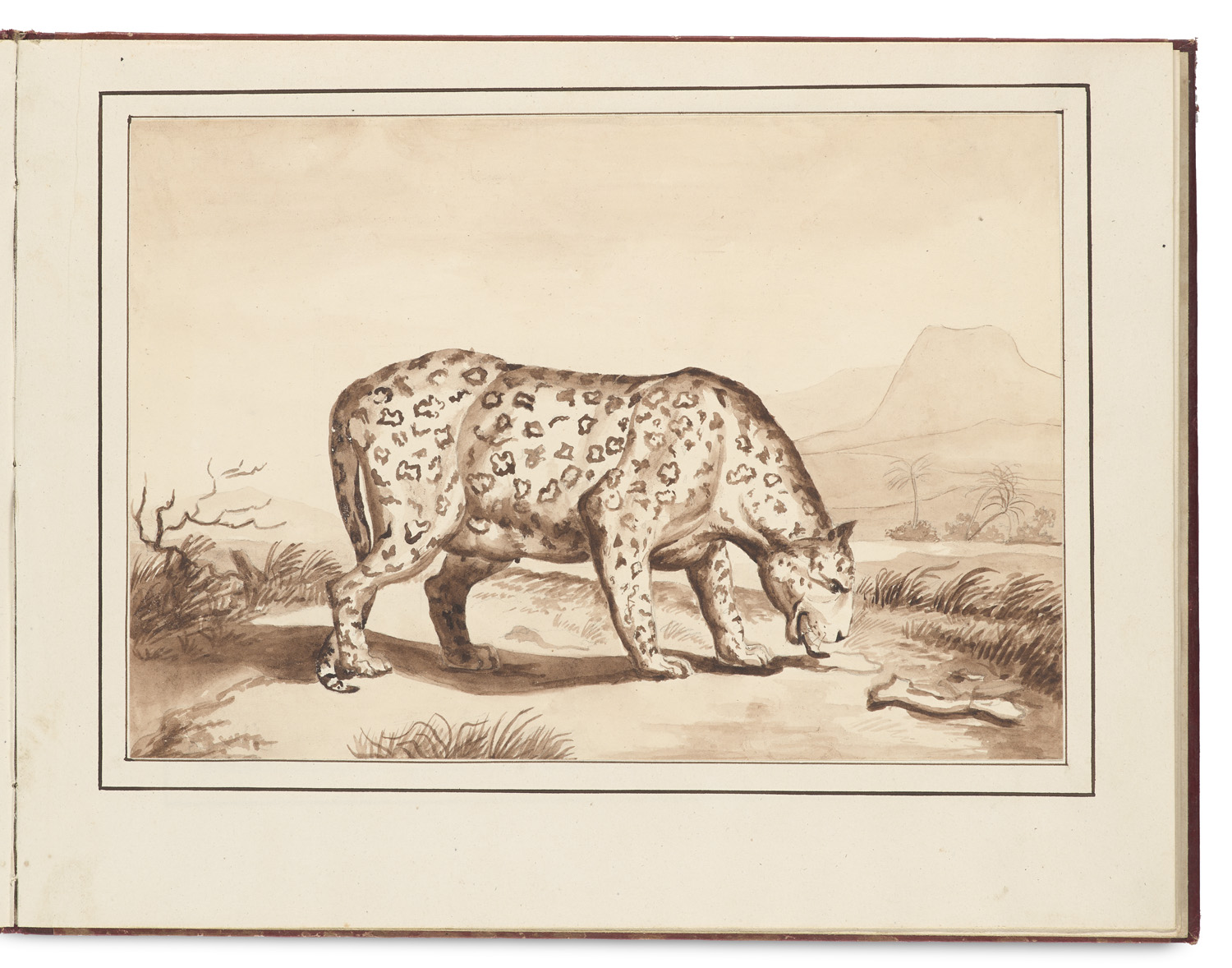 Naturwissenschaften – Aus dem Besitz der Schweizer Adelsfamilie Grand d'Hauteville, im Innendeckel mit Exlibris der "Bibliotheque du Chateau d'Hauteville". - Mit fein ausgeführten Zeichnungen, teils exotischer Tiere wie einem Löwen, Leoparden, aber auch Ziegen, Pferde, Hunde, ein Hirsch u.a. - Die Zeichnungen teils nach Arbeiten von Künstlern wie Nicolaes Visscher, Paulus Potter, Dirk Stoop u.a. - Die montierten Arbeiten je mit eingezeichneter Rahmung in brauner Tinte - Im Blattrand minimal (finger)fleckig, Gelenke angebrochen, hierdurch Bindung leicht gelockert. Insgesamt gut. Kontraststarke und ausgesprochen feinzeichnerische Arbeiten.