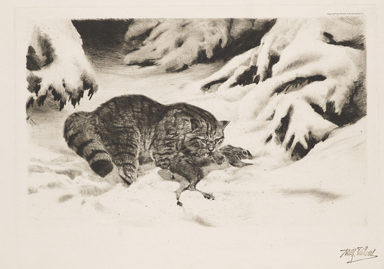 Wildkatze bei der Hasenjagd. Berlin, Amsler & Ruthardt, O.J. Radierung auf Velin. 23 x 35 cm (32 x 51 cm). Mit Signaturstempel.
