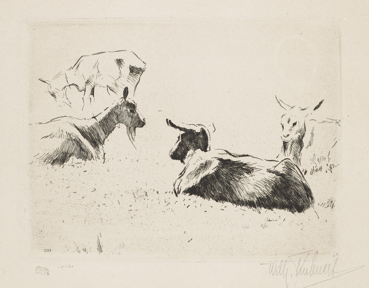 Naturwissenschaften – Je eins von 60 nummerierten Exemplaren. - Enthält: Liegende Rinder. 32,5 x 42 cm. - Ziegen. 1921. 24,5 x 32 cm. - Bekannt durch seine Tierbilder, Wilhelm Kuhnert (1865-1926) war ein deutscher Maler, Autor und Illustrator. - Leicht stockfleckig. Insgesamt sehr gut erhaltene und feinlinige Radierungen.
