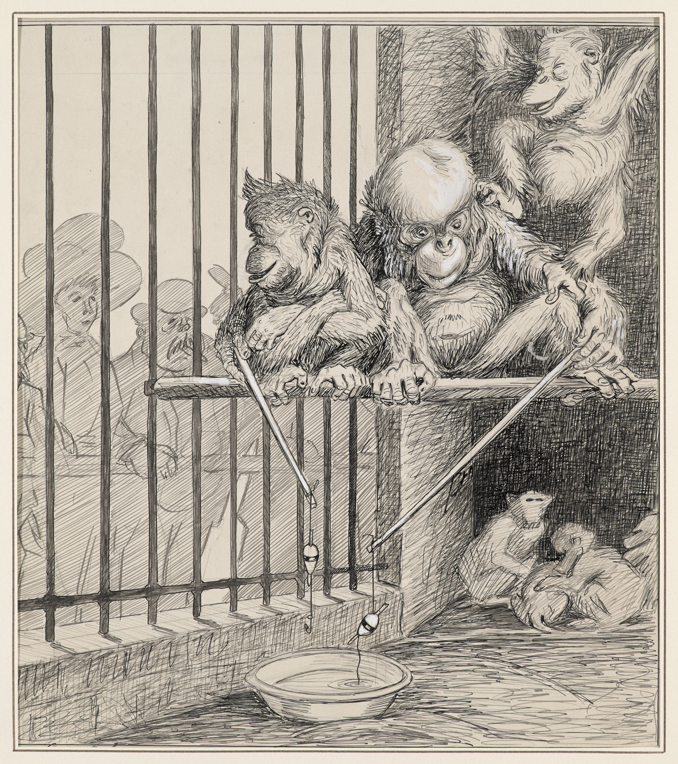 Junge Orang Utans. 1910. Tuschfeder- und Bleistiftzeichnung, teils weißgehöht. 40 x 35,5 cm. Signiert und datiert, verso gestempelt. In Punkten unter Passepartout montiert.