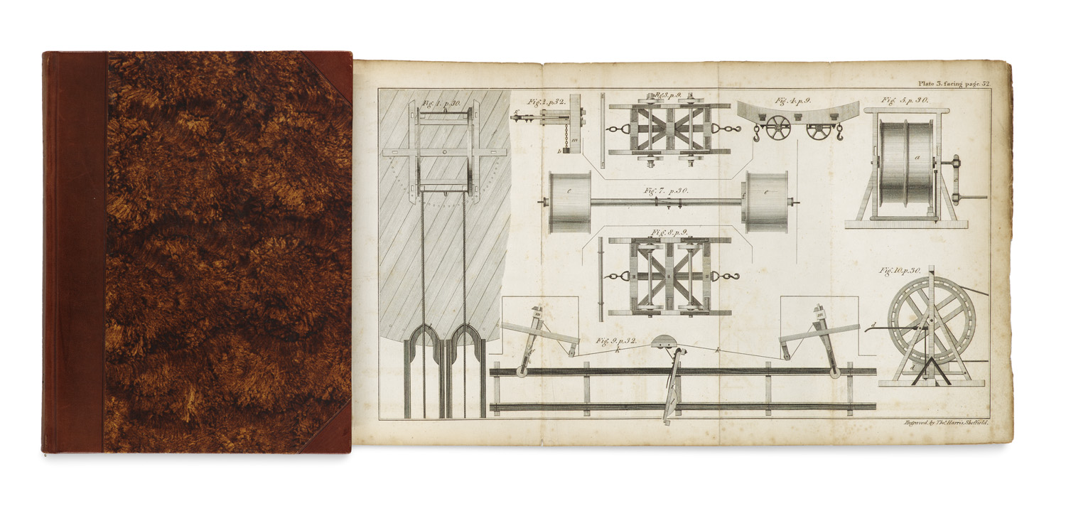 Technik – Erste Ausgabe der bedeutenden Abhandlung über Gussschienen und den Gebrauch von Dampfmaschinen in Kohlegruben. - Hoover Collection 244 - Kress B.3373 - Ottley 2598 - Curr scheint als erster den Spurkranz eingesetzt zu haben, und zwar zuerst unterirdisch in den Sheffielder Gruben. - Name auf Vorsatz, etwas gebräunt bzw. braunfleckig.