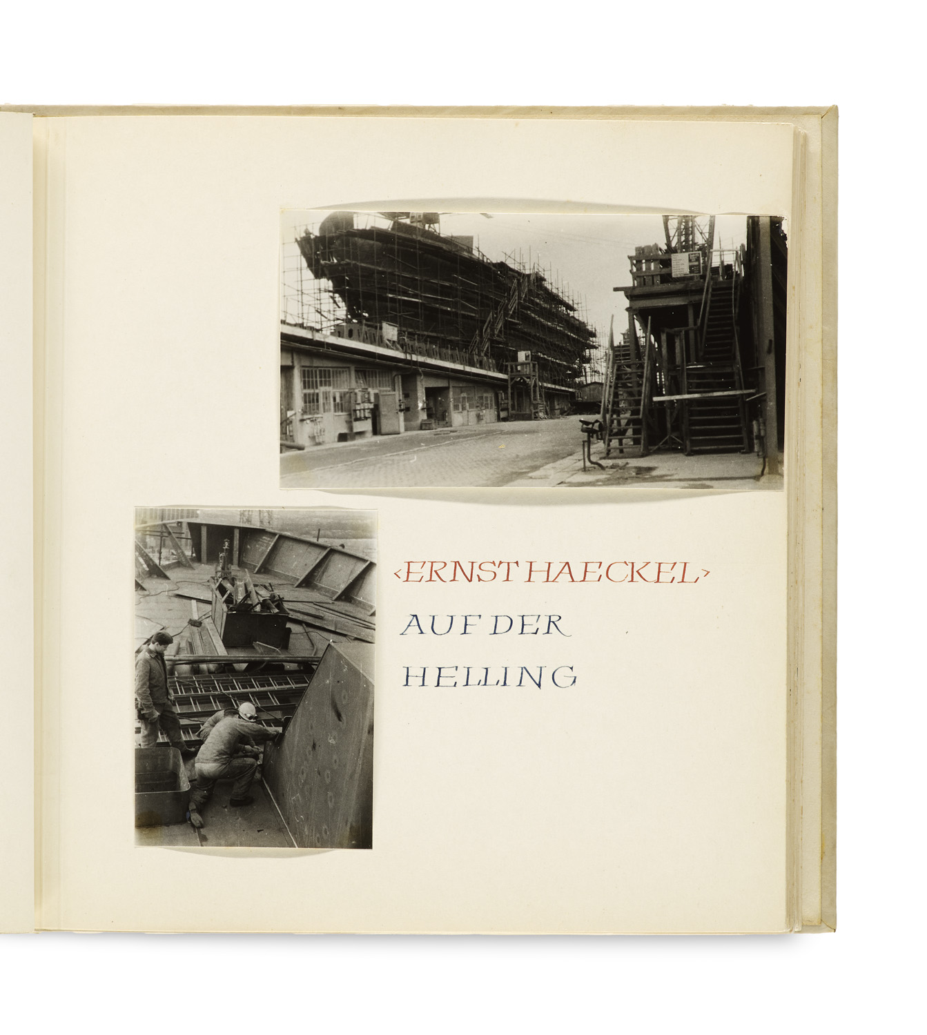 Technique – With 24 photographic images and 3 hand-drawn illustrations in colored pencil. Half leather with gold-stamped title (slightly dusty). - Handwritten commemorative publication for the ceremonial commissioning of the fishery research vessel MS "Ernst Haeckel." It was built for the Institute for Deep-Sea Fisheries and Fish Processing in Rostock-Marienehe and, after its delivery, was presented to the public for nine days at the International Fisheries Exhibition in London. It was named after the German zoologist Ernst Haeckel. - Slightly foxed. Overall very well preserved. Very neatly executed manuscript with decorative illustrations.
