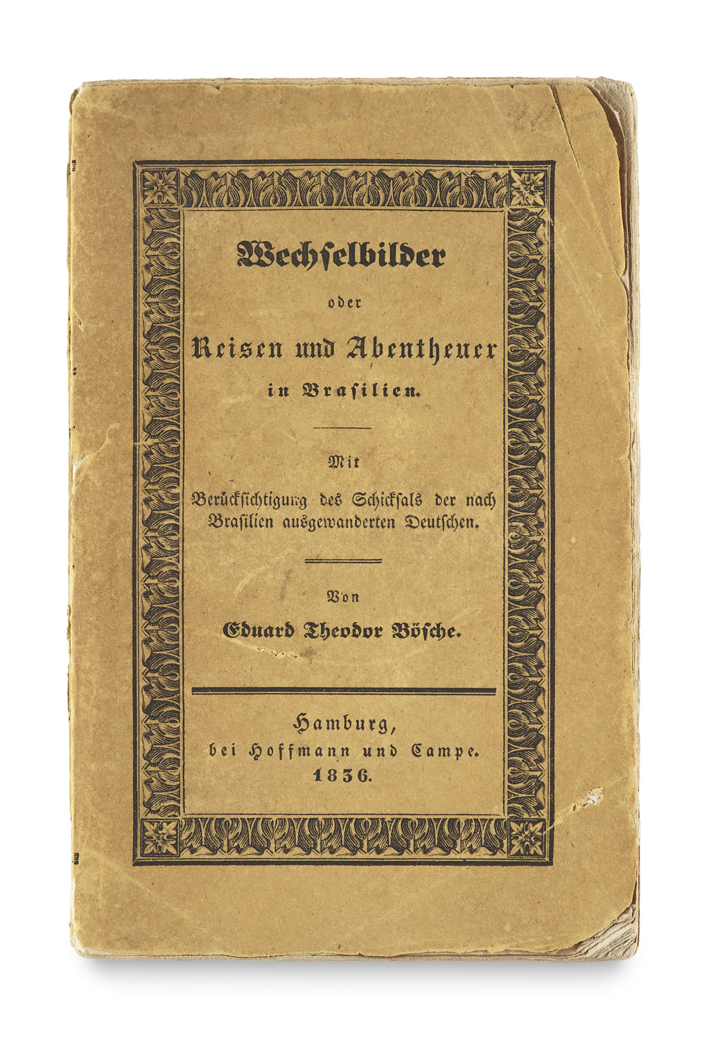 Wechselbilder von Land- und Seereisen, Abentheuern, Begebenheiten, Staatsereignissen, Volks- und Sittenschilderungen während einer Fahrt nach Brasilien und eines zehnjährigen Aufenthalts daselbst, in den Jahren 1825 bis 1834. Hamburg, Hoffmann und Campe, 1836. 1 Bl., 300 S. Kl.-8°. OBroschur mit DTitel und RTitel (knickspurig, Gelenke angebrochen).