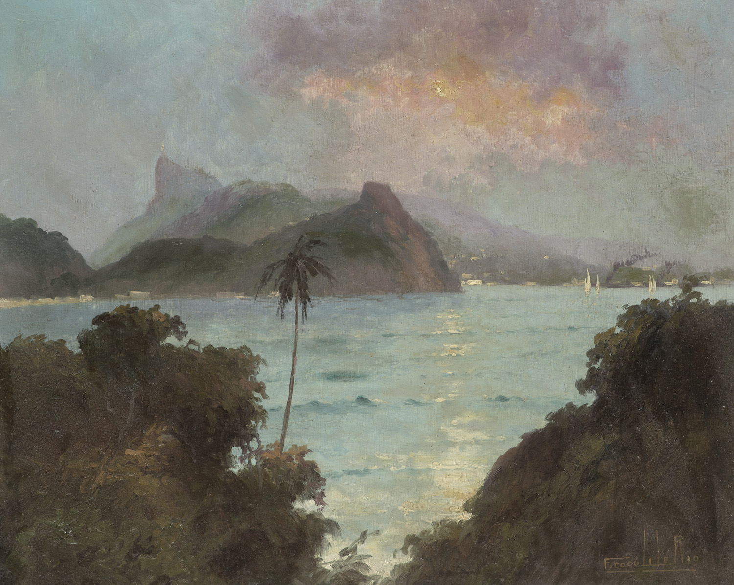 Geographie und Reisen – Der brasilianische Landschaftsmaler Coculilo studierte in Rio de Janeiro bei dem Katalanen Luis Graner. Er ist bekannt für seine Ansichten von Rio und dessen Umgebung, welche er oft von seinem Wohnort in Niterói malte. - Stimmungsvoll und in warmem Licht fängt Coculilo in der dargestellten Szene den Berg Corcovado ein, auf welchem sich seit 1931 die monumentale Christusstatue steht, welche als Wahrzeichen der Stadt gilt. - Firnis partiell leicht angegilbt, im linken Rand mit Spuren der Rahmung sowie kleinem Löchlein, mit leichter Oberflächenanstaubung, unter UV vereinzelt und punktuell fachmännische Retuschen erkennbar. Insgesamt sehr gut. Ausgesprochen pittoreske Ansicht in lockerem Duktus.