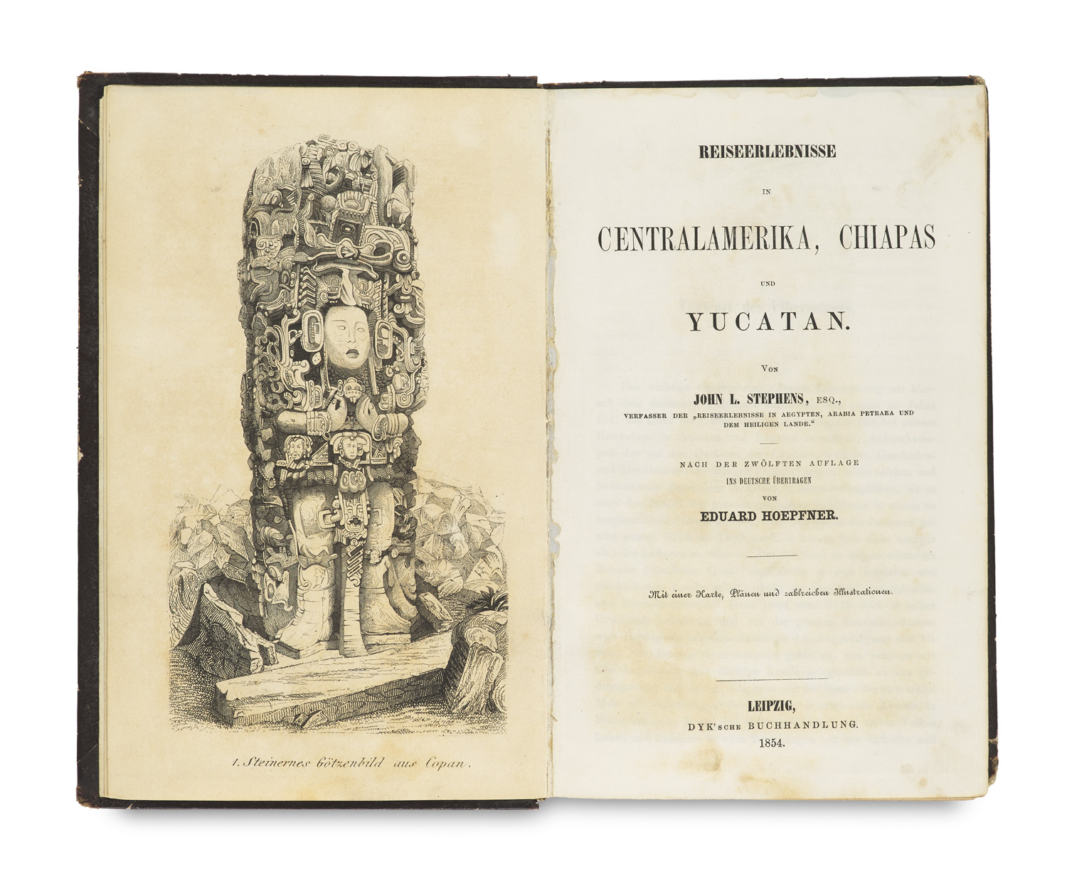 Reiseerlebnisse in Centralamerika, Chiapas und Yucatan. Nach der zwölften Auflage übersetzt von Eduard Hoepfner. Mit 57 Tafeln und 1 gefalt. Karte. Leipzig, Dyk, 1854. XIII, 554 Seiten. Halbleder d. Zt. mit RTitel (etwas beschabt, oberes Kapital mit kleiner Läsur).