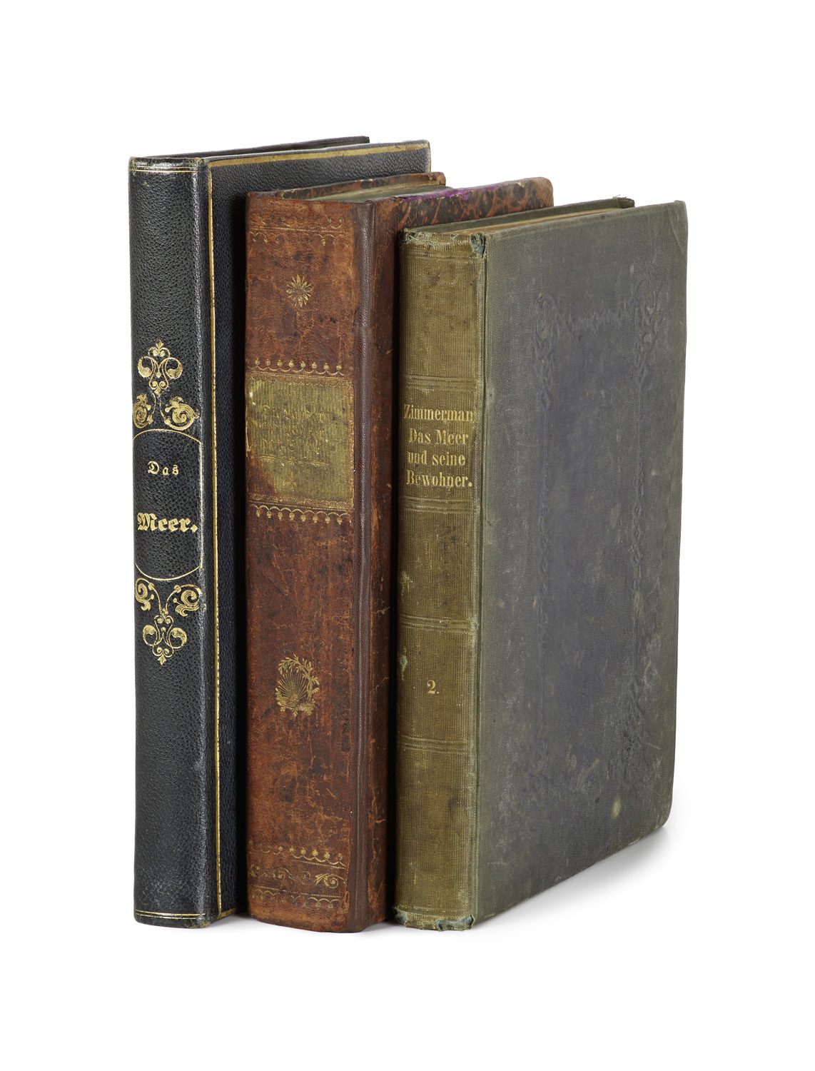 Geographie und Reisen – 3., nach dem jetzigen politischen Stand der Dinge bearbeitete Auflage.- Die Kupferstiche zeigen u. a. die Niagara-Fälle, Einheimische aus Neuseeland, Mexiko, den Gesellschaftsinseln usw. in ihren Trachten. - Dabei: Loewenberg, J., Das Meer. Mit 8 Kupfern. 2.A. Berlin, Hasselberg, (1840). Verz. Ldr. d. Zt. mit gekrönter Initiale "S". - Zimmermann, Das Meer. 2.Th. Mit 10 teils kol. Taf. (ohne Titelbl.). ca. 1840. OLwd. (etw. fl.).