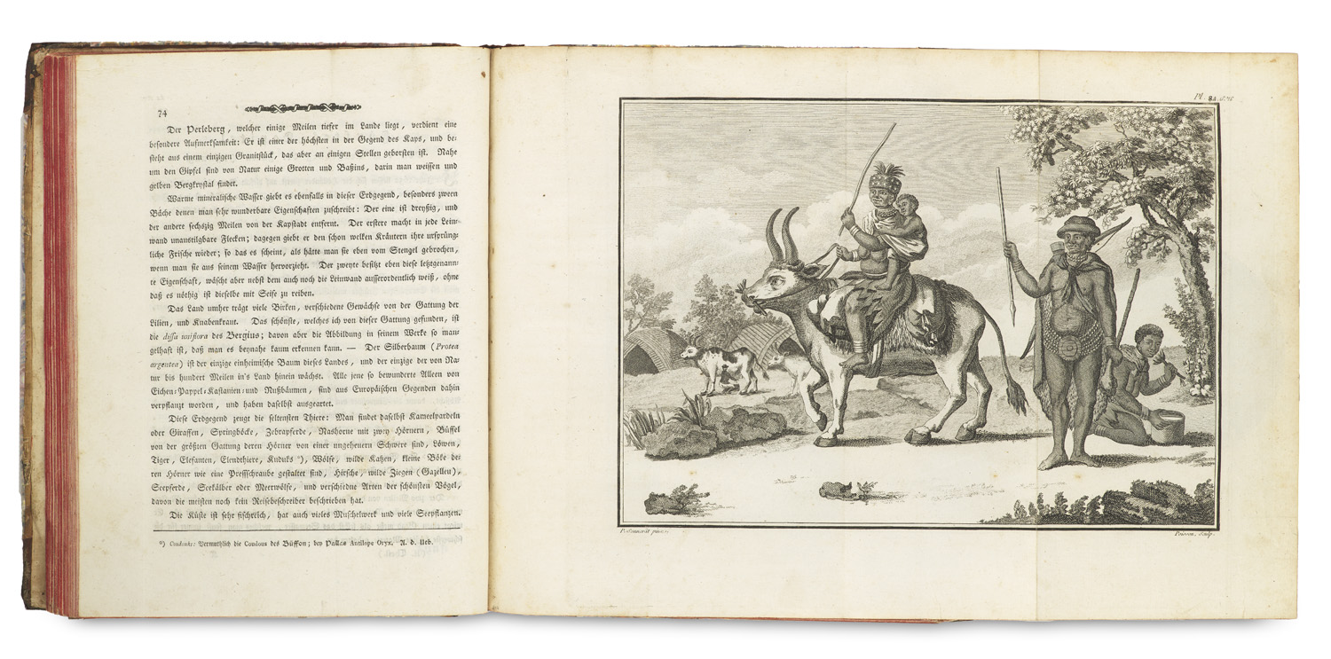 Geography and Travel – China. - India. - Two volumes in one. With 2 engraved title vignettes by Geßner, 140 (some folded) copper engraving plates. - Contemporary half leather , label to spine (minimally rubbed, chafed and with smaller defects). - First German edition. - Classical Journey to the Far East, also contains descriptions of expeditions to Ceylon, the Philippines, Moluccas, the Cape of Good Hope, etc. - The beautiful coppers with illustrations of views, costumes, customs, and fauna such as mammals, birds, plants, etc. - All in all good, wide-margined specimens. All in all good, large paper copies.