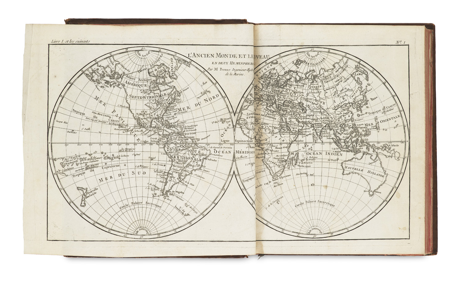 Atlas de toutes les parties connues du globe terrestre. Mit 50 doppelblgr. Kupferstichkarten von R. Bonne, davon 1 gefalt. (Genf, Pellet, um 1780). 3 Bll., 28 S. 4°. Ldr. d. Zt. mit goldgepr. RSchildchen u. RVerg (berieben und bestoßen, leicht wurmstichig).