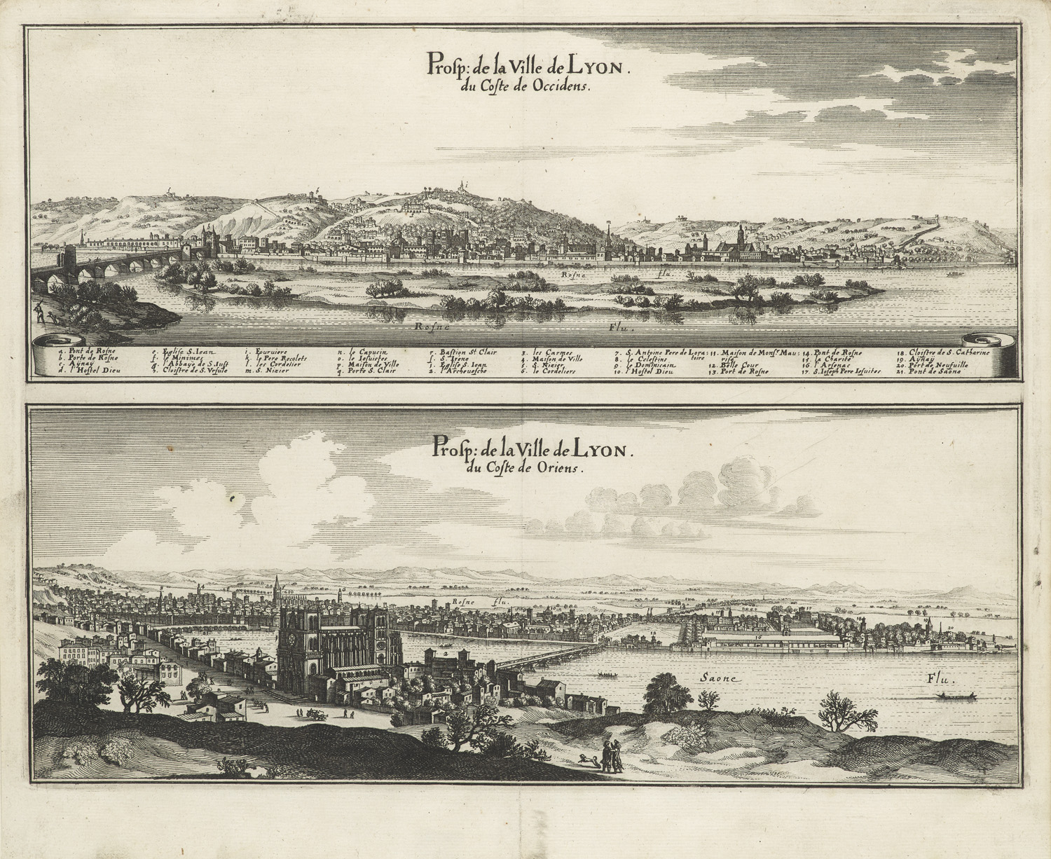 Zwei Blätter mit je zwei gestochenen Ansichten Lyons. 1. Prosp: de la Ville de Lyon, du Coste de Occidens. Prosp: de la Ville de Lyon, du Coste de Oriens. 2. Prosp: de la Ville de Lyon, du Coste de Septentrio. Prosp: de la Ville de Lyon, du Coste de Meridies. Caspar Merian, Frankfurt, 1657. 30,5 cm x 38 cm (27 cm x 35,3 cm). Je unter Glas gerahmt.