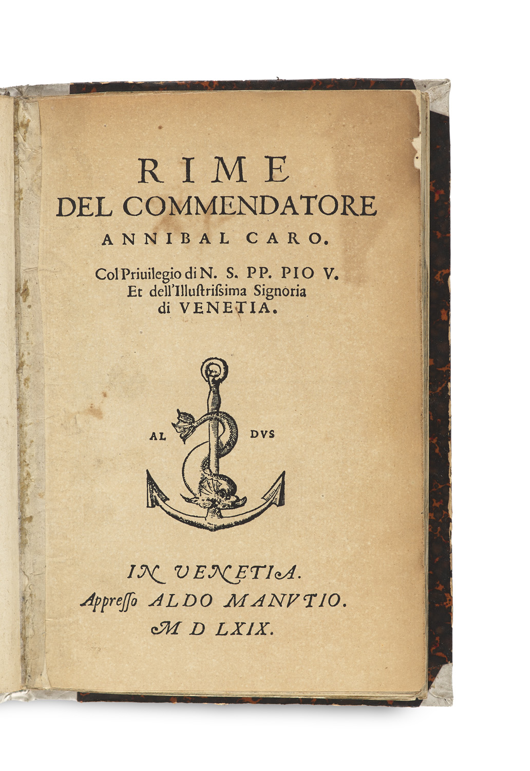 Rime del commendatore Annibal Caro. Mit Duckermarke (Aldinische Delphin) und 5 belebten, teils großen Initialen im Holzschnitt. Venedig, Aldo Manuzio Sohn, 1569. 4 Bl. (Tit., Widm., Priv.), 103 (1) S., 4 Bl. (Inhaltsverz.) 8°. Hldr. d. 19. Jh. mit goldgepr. RTit. auf Ldr.-Schildchen, mit Steinmarmorpapier überzogenen Decken, Vorsätzen aus gestrichenem Kammmarmorpapier und gesprenkeltem Schnitt (etwas berieben und angeschmutzt).