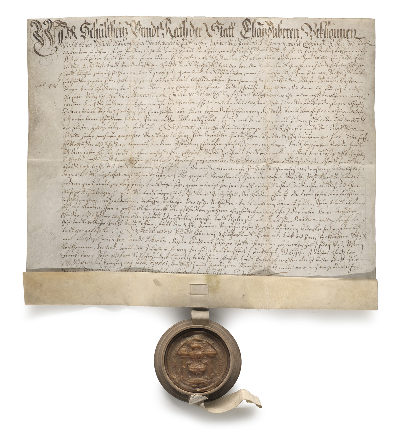 Manuskripte und Urkunden – Schultheiß Unndt Rath der Statt Elsaß Zabern Bekhönnen den Verkauf des "Graßgärthels" "bey der Schwartzbach gelegen" von Jost Joachim Westermann an den Küster "Meister Mülaus" und dessen Frau Anna Maria. - Mehrfach gefaltet, Tinte an den Falzen leicht verblasst, etw. angestaubt, sonst wohlerhalten.