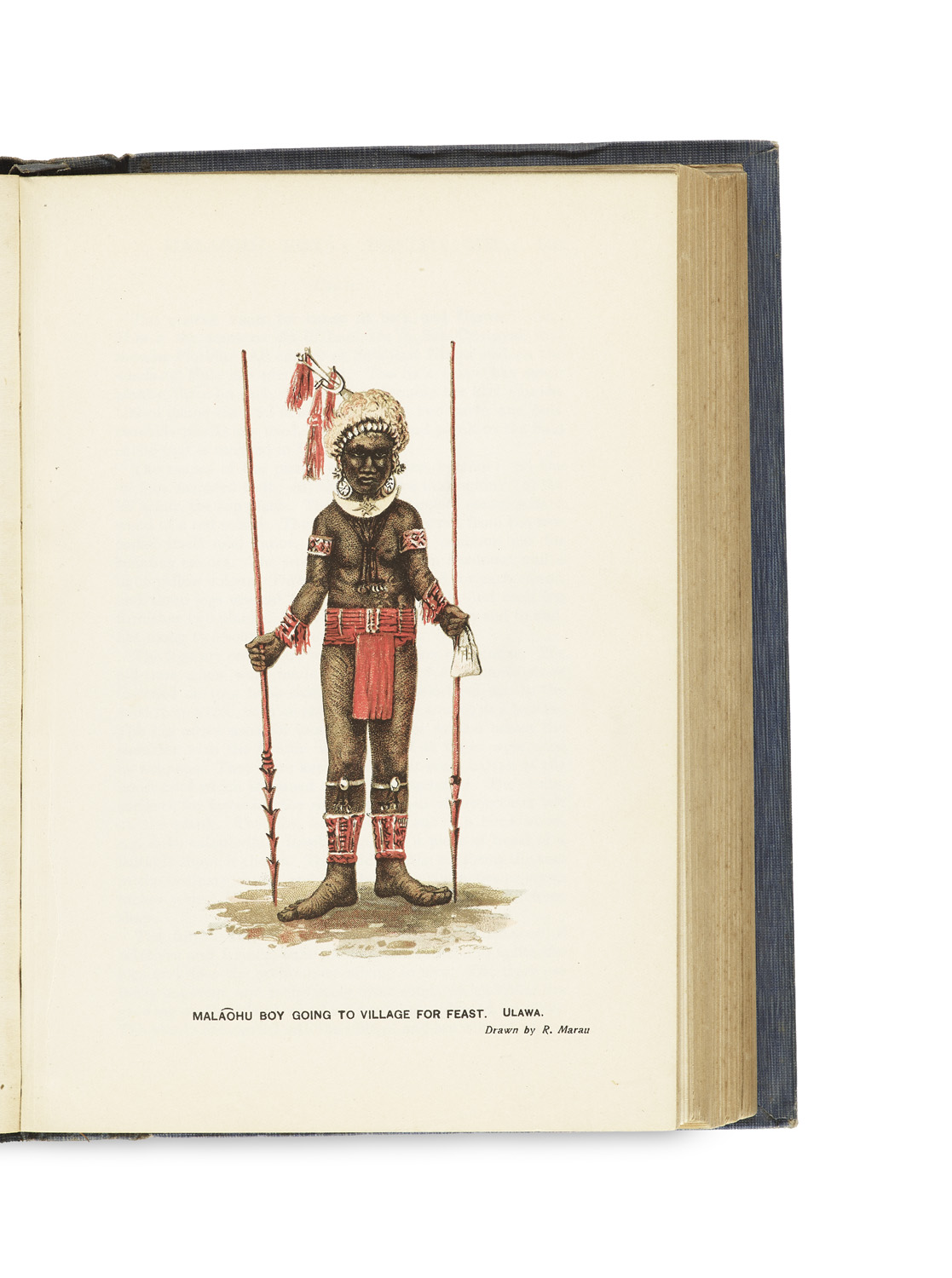 Geography and Travel – Oceania - Solomon Islands - First edition. With 1 chromolithographic frontispiece, 2 chromolithographic and 14 photographic plates, 2 maps and numerous illustrations in the text). Blue cloth with gilt stamped title to spine (some rubbing and chafing, edges slightly foxed). - Back joint cracking, slight browning due to paper, endpapers slightly foxed, otherwise well preserved.
