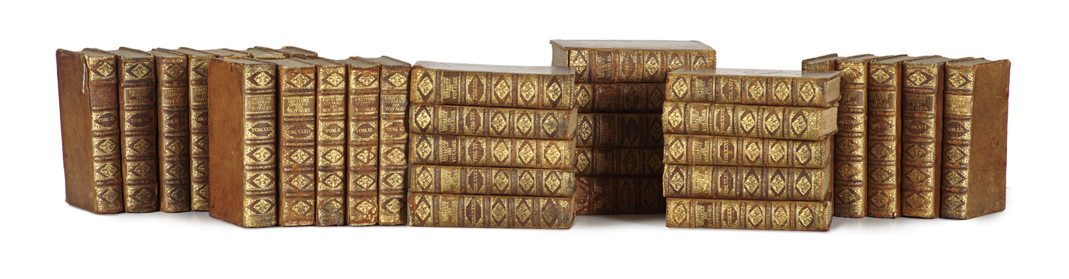 Histoire Génerale des Voyages, ou nouvelle collection de toutes les relations de voyages par mer et par terre ... 32 (v. 80) Bänden. Mit 225, wovon 160 gefalteten Kupferkarten und -plänen, sowie zahlreichen illustrierten Zierleisten und Initialen im Holzschnitt. Dresden, Walther, 1747-49 u. Paris, Didot, 1750-57. 12°. Gesprenkelte und geglättete uniforme Ldr. d. Zt. mit RSchild, Stehkantenpräg. u. floral dekorierter RVergold. (Rücken an den an den Kapitale teils mit Fehlstellen, etwas bestoßen, beschabt und berieben, stellenweise leicht fleckig).