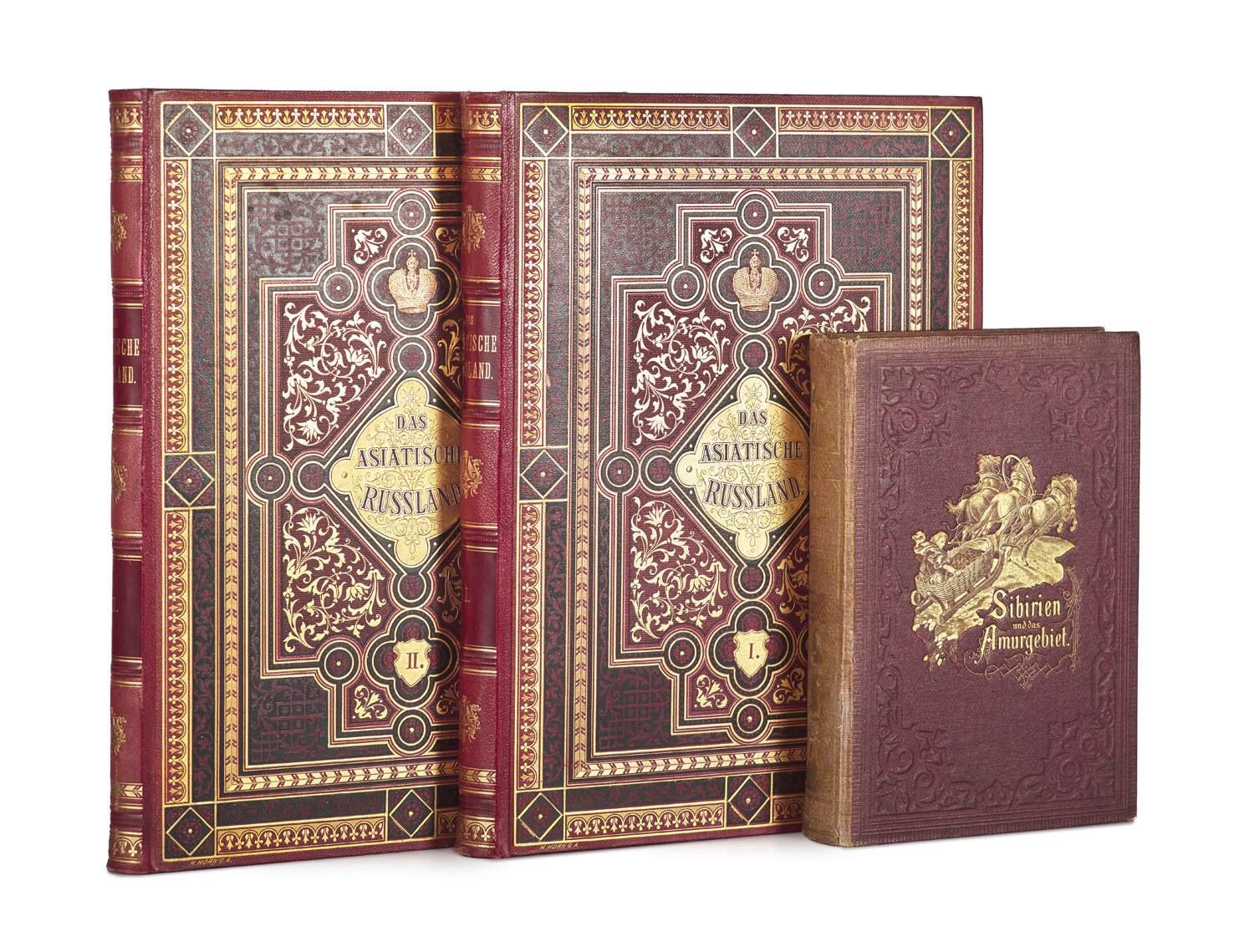 Geographie und Reisen – Erste Ausgabe. - Der erste Teil beschreibt den Kaukasus, mit einem Bericht von Friedrich Bodenstedt: Erinnerungen an den Kaukasus, und das transkaspische Gebiet. Der zweite Teil beschreibt Turkmenistan mit Buchara, das russische Turkestan und Sibirien. - Papierbedingt gebräunt u. teils leicht stockfleckig, insg. aber gutes, dekoratives Exemplar. - Dabei: Kohn/Andree, Sibirien und das Amurgebiet. 2 Tle. in 1 Bd. Mit zahlr. Abb. Leipzig, Spamer, 1876. (Das neue Buch der Reisen und Entdeckungen). OLwd. (etw. berieben u. gelockert, R. verblasst, Vordergelenk etw. einger.). 2.A. - Kennan, G., Sibirien. 3 Bde. Lpz., Reclam, 1891. Kl.-8°. OBrosch. (etw. bestossen).
