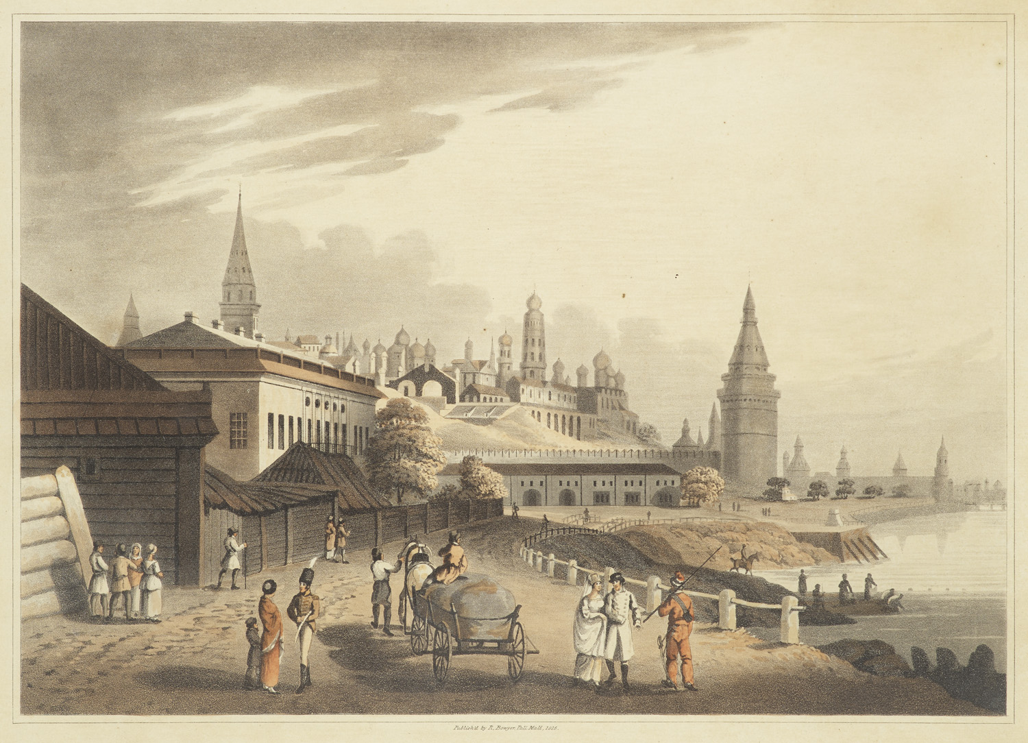Geographie und Reisen – Detailreiche Ansicht des Kremls vom Ufer der Moskwa. Spaziergänger, sowie eine Pferdekutsche sind im Vordergrund zu sehen. - Von dem englischen Maler und Verleger Robert Bowyer. - Augenscheinlich gut erhalten.
