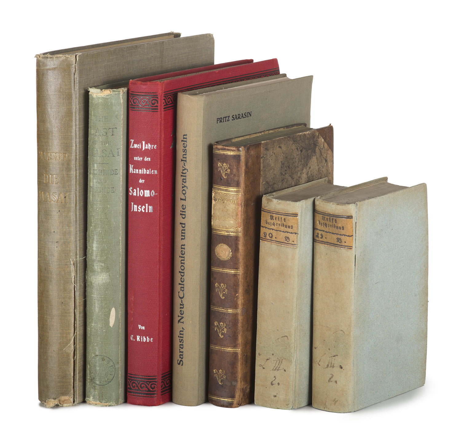 Geographie und Reisen – Enthält: Bartram, W., Reisen durch Nord- und Süd-Karolina, Georgien, Ost- und West-Florida ... 2 Bde. Mit 7 (v. 8) Kupfert. Wien, 1793 (Mag. v. merkw. Reisebeschr. 19/20).Pp. d. Zt. (etw. fl., R. mit Einr.). - Dass. Ausgabe Berlin, Voss (Magazin ... Bd. 10). Mit 4 Kupfert. HLdr. d. Zt. (wasserrandig). - Ribbe, C., Zwei Jahre unter den Kannibalen der Salomo-Inseln. Berlin 1903. OLwd. - Sarasin, F., Neu-Caledonien und die Loyalty-Inseln. Basel 1917. OLwd. - Merker, M., Die Masai. 2.A. Berlin 1910. OLwd. (Gebr.-Sp.). - Hinde, S.L., The Last of the Masai. London1 1901. OLwd. (Gebr.-Sp.).