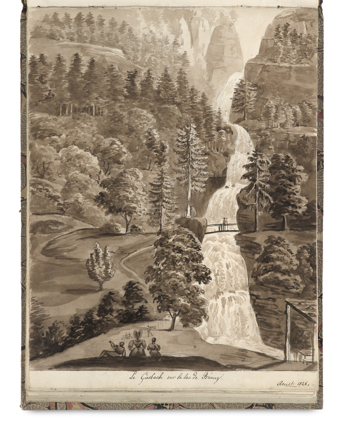 Album mit 20 Original-Zeichnungen mit Landschaftsdarstellungen der Schweiz. Juni-August 1828. Versch. Techniken, darunter Bleistift, Federzeichnungen, teils laviert, auf Velin. Je ca. 22 x 28 cm. Fest gebunden. Überwiegend mit hs. Bezeichnung sowie Datierung in französischer Sprache. Quer gr. 8°. Marmorierter Pp. d. Zt. (etw. beschabt u. berieben).
