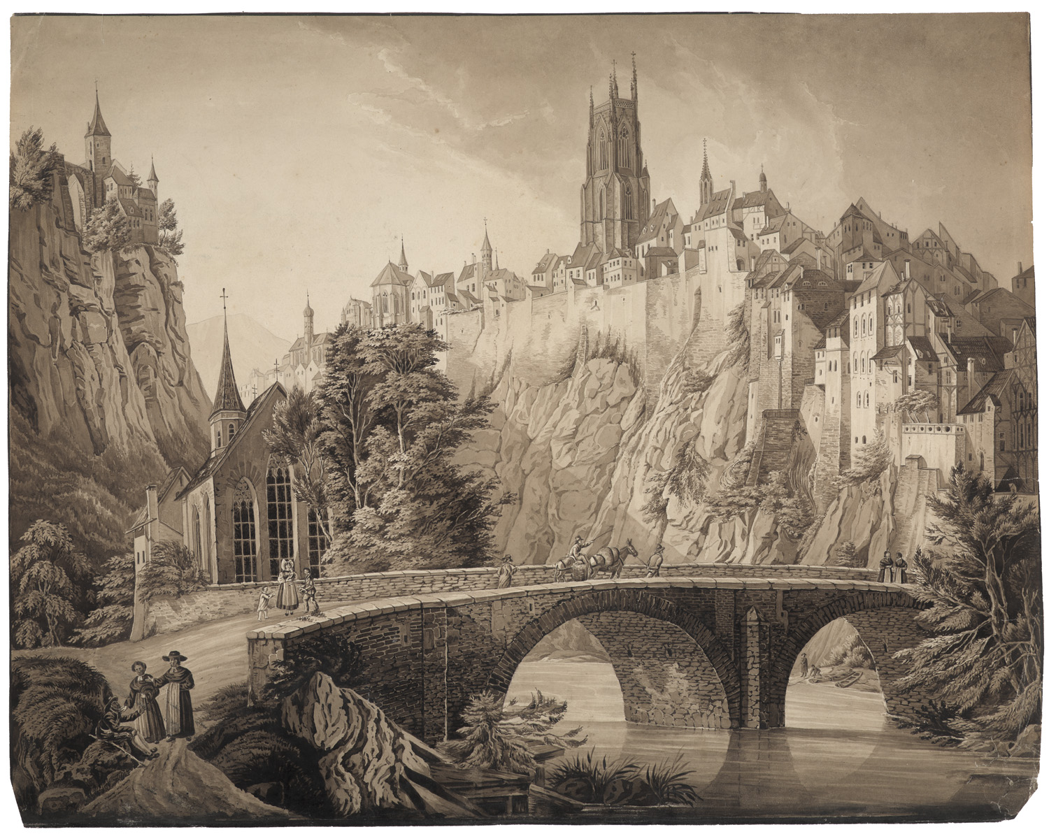 Freyburg in der Schweiz, Blick von der Saane über die Brücke auf die Stadt. Um 1830. Sepiazeichnung auf Velin. 49 x 63 cm.