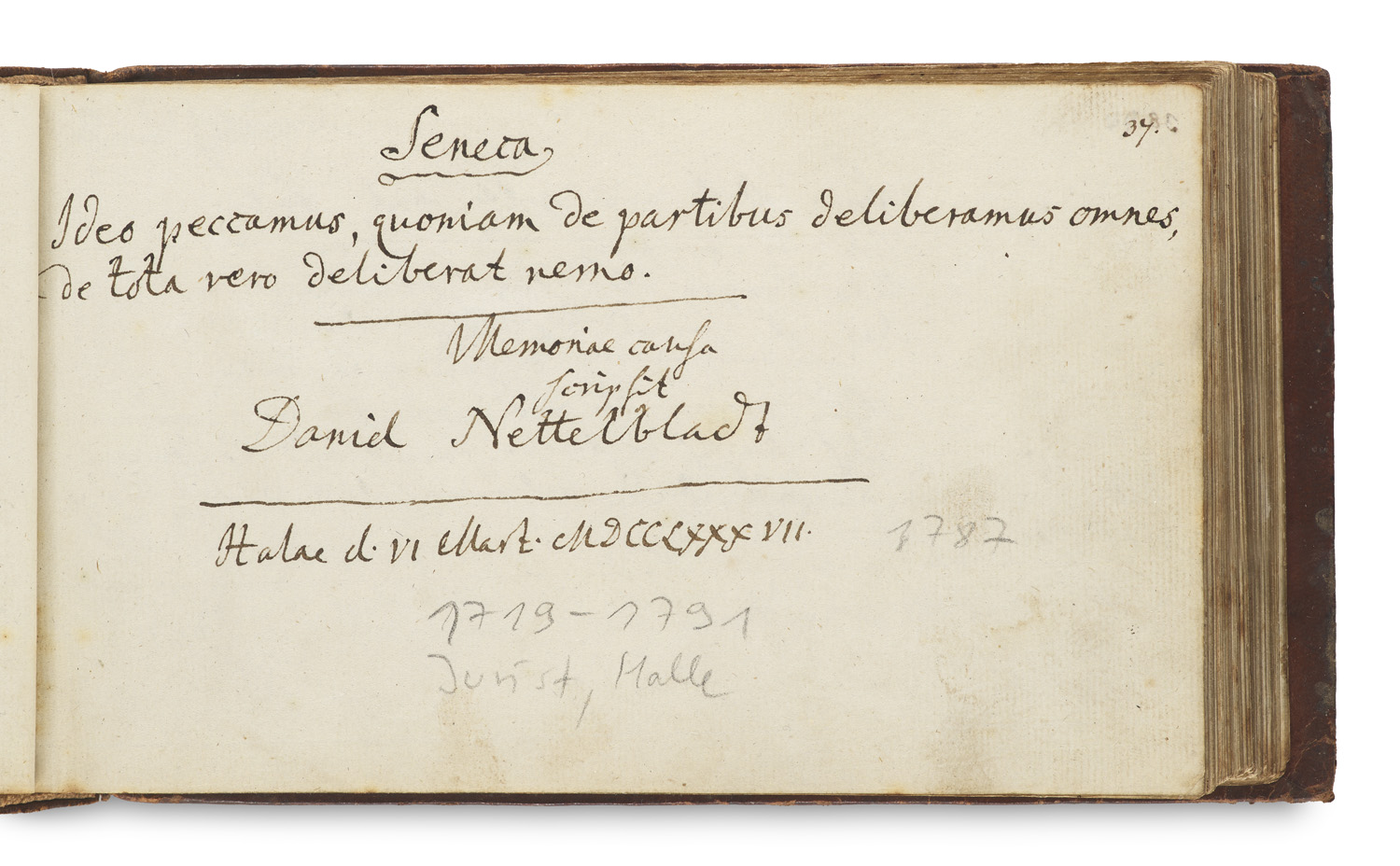 Manuscripts – Album amicorum of the jurist Johann Franz August Lampe (1765-1823) from Schildesche (Bielefeld) with more than 100 entries, mainly by fellow students from Halle, including the important legal scholar Daniel Nettelbladt (1719-1791). With 1 engr. border, 2 drawings and 1 mounted silhouette. Gilt stamped cloth with three gilt edges, later spine label (rubbed and bumped) and coloured paper endpapers. - Besides that of Nettelbladt with entries by: among others, as listed above. - Partly with annotations in pencil with biographical data. - 1 leaf with handwritten note by a descendant. - Some leaves removed, some browning, foxing and fingerstaining, otherwise overall well preserved.