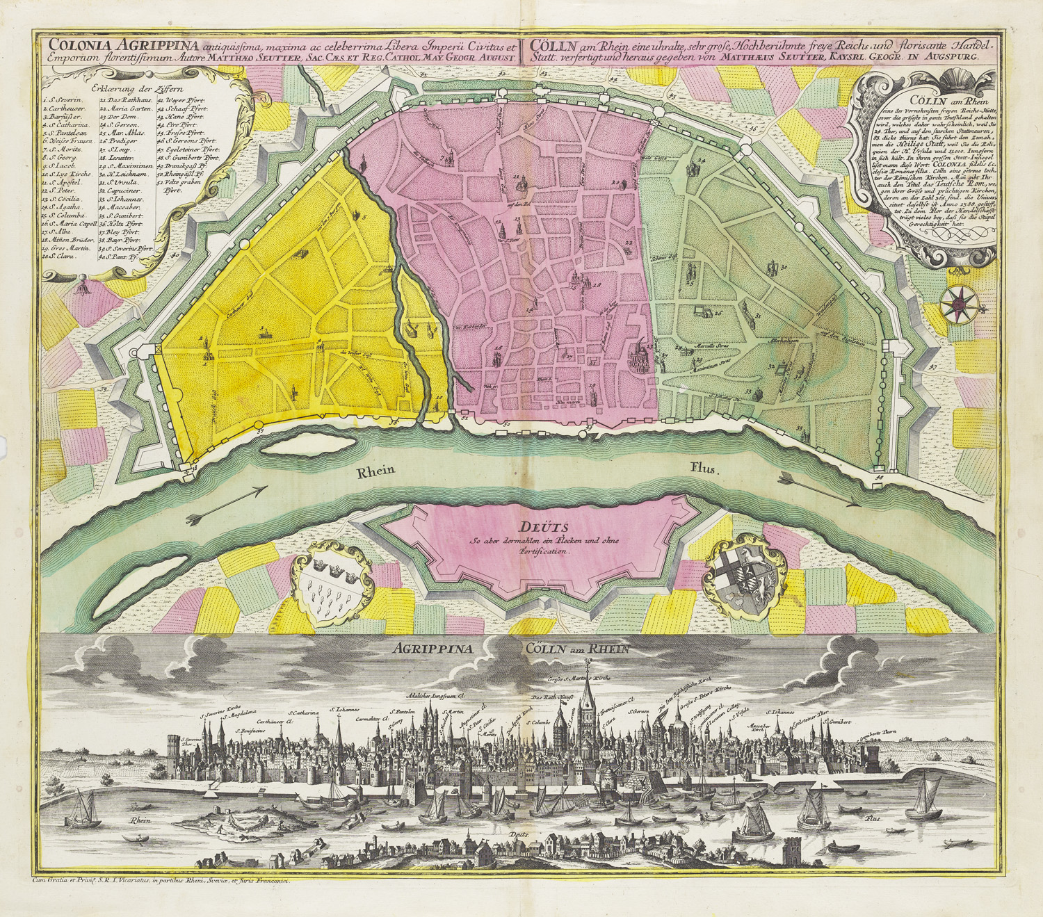 Dekorative Graphik - Karten – Panorama der Stadt mit Blick über Deutz und dem Rhein im unteren Drittel des Stichs betitelt "Agrippina Cölln am Rhein". Zweisprachiger Titel und Legende, sowie Historie der Stadt. - Mittelfalz verso hinterlegt, recto leimschattig. Randläsuren, kleine Einrisse. Fleckig. Insgesamt prachtvoll karte in leuchtendem Kolorit.