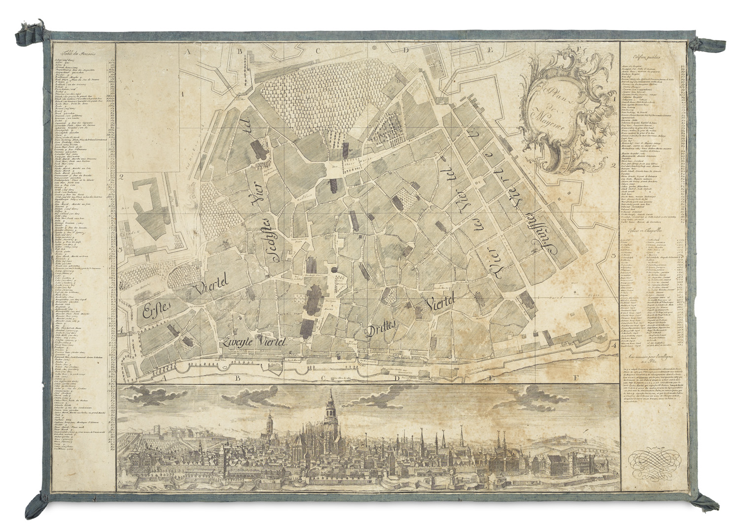 Prints and Engravings - Maps – 18th century. Copperplate engraving. - Large-format map of the city of Mainz with a panoramic view of the city in the lower quarter of the print. Legends on the left and right edges. - Trimmed to the platemark. Mounted on linen, with reinforced edges on the reverse. Stained and creased. Overall, a very beautiful map of Mainz in the 18th century. Detailed view of the city and finely engraved.