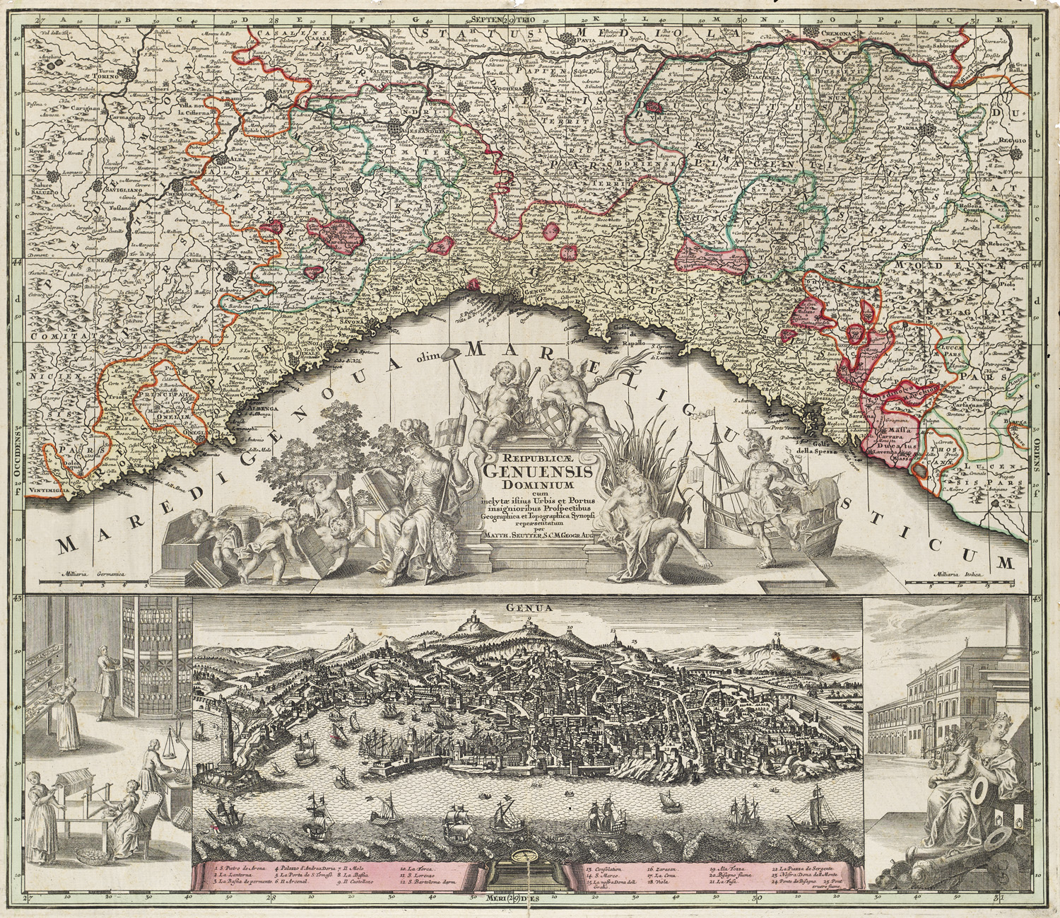 Reipublicae Genuensis Dominium. Grenzkolorierte Kupferstichkarte mit der Ansicht von Genua. Augsburg, um 1740. 50 x 57,5 cm (51,5 x 58,5 cm).