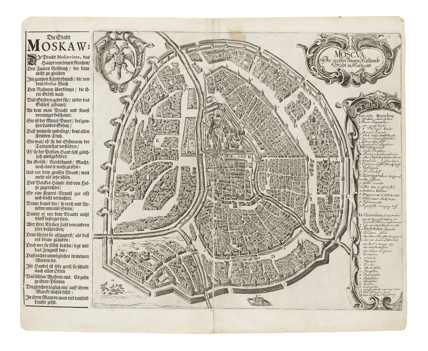 Prints and Engravings - Maps – Moscow - Copperplate engraving on laid paper with cartouche, coat of arms, and legend. - With a multi-line poem on the left, not printed in the plate. - Backed to the verso of the centerfold. Marginal wear and light staining. Overall in good condition.