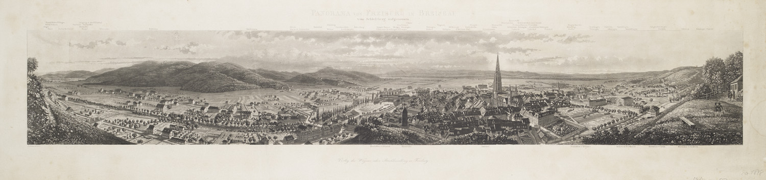 Panorama von Freiburg im Breisgau vom Schlossberg aufgenommen. Radierung mit Aquatinta nach Franz Schmid im Verlag der Wagner'schen Buchhandlung in Freiburg, um 1850. 14 x 87,5 cm. (20,5 x 92,5 cm.) Mit d. Titel, Legende u. Adresse am oberen und unteren Rand.