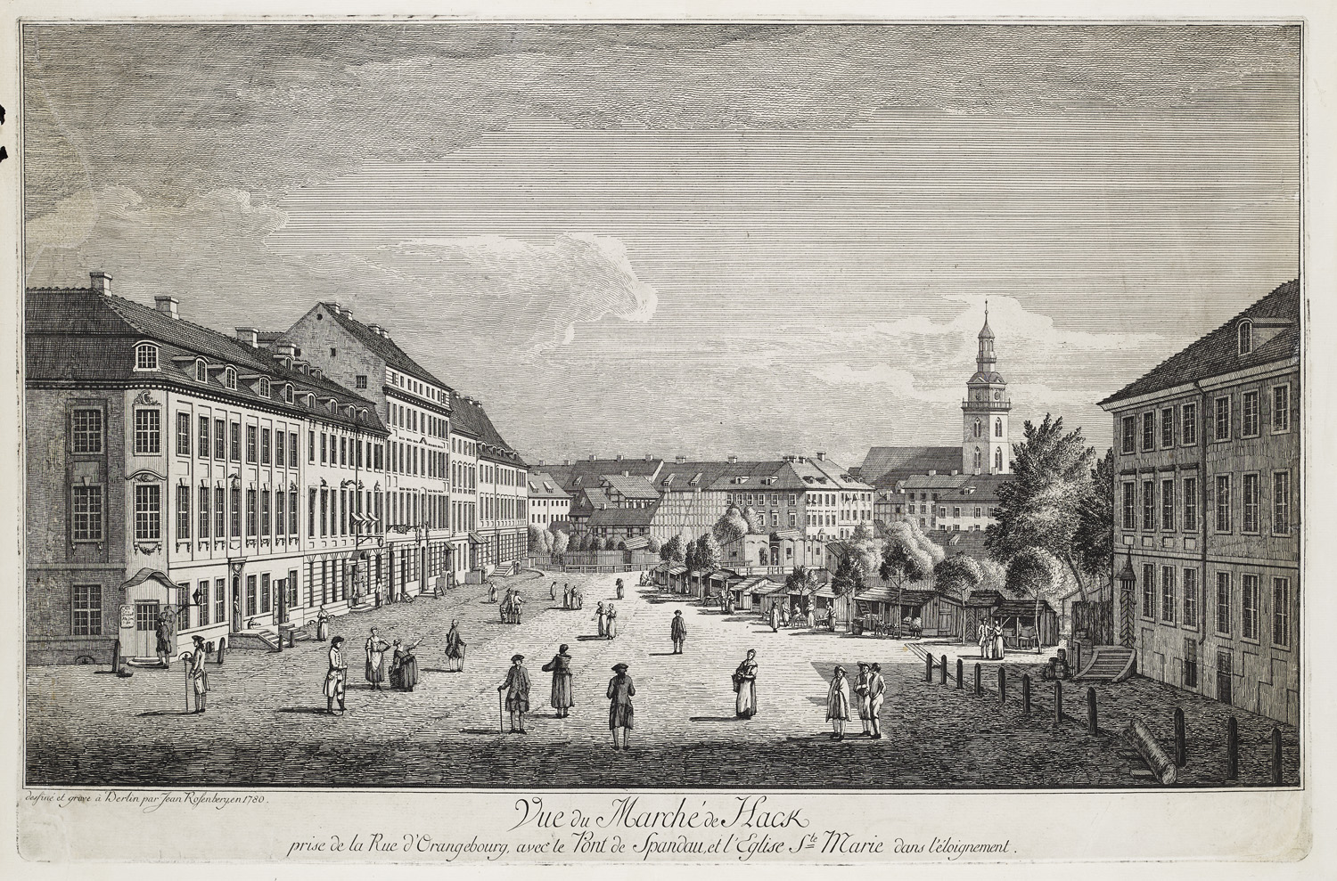 Vue du Marché de Hack prise de la Rue d' Orangebourg, avec le Pont de Spandau et l' Église St. Marie dans éloignement. OKupferstich mit Ansicht des Hackeschen Markts, Berlin. Jean Rosenberg, 1780. Blattmaß 49 x 71,5 cm. Unterhalb des Motivs mit gestoch. Titel sowie Angaben zum Kupferstecher.