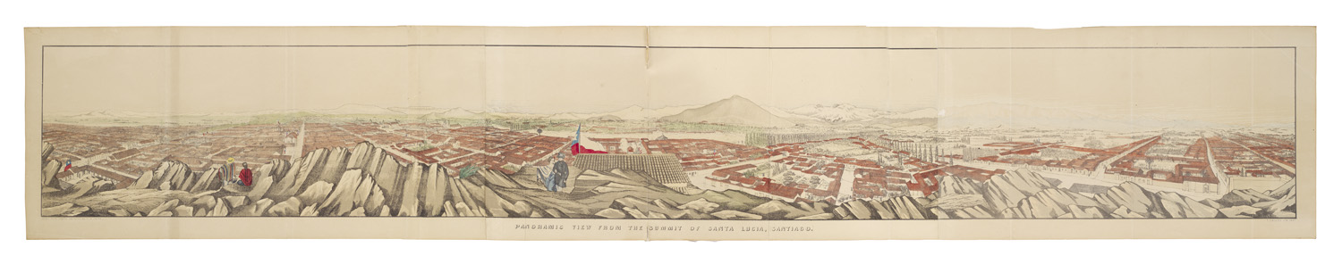 Prints and Engravings - Views – Chile - Panoramic view from the summit of Santa Lucia, Santiago. Toned and partially hand-coloured original lithograph. Spot-mounted to backing. - Print in three parts, at that time probably the largest printed lithograph. - Folded in the middle, browned due to the paper, with several creases, some with short tears, on verso with traces of previous mounting. Overall still in good condition.