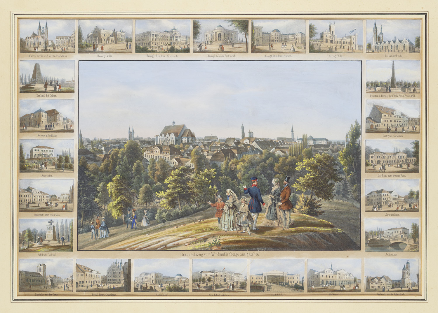 Erinnerung an Braunschweig. Braunschweig vom Windmühlenberge aus gesehen. Kolorierte Lithographie mit 24 Randansichten. (Nach der Natur gezeichnet von Gustav Taubert. Braunschweig, Ramdohr, 1847.) 37,5 x 53,5 cm. Unter Passepartout montiert.